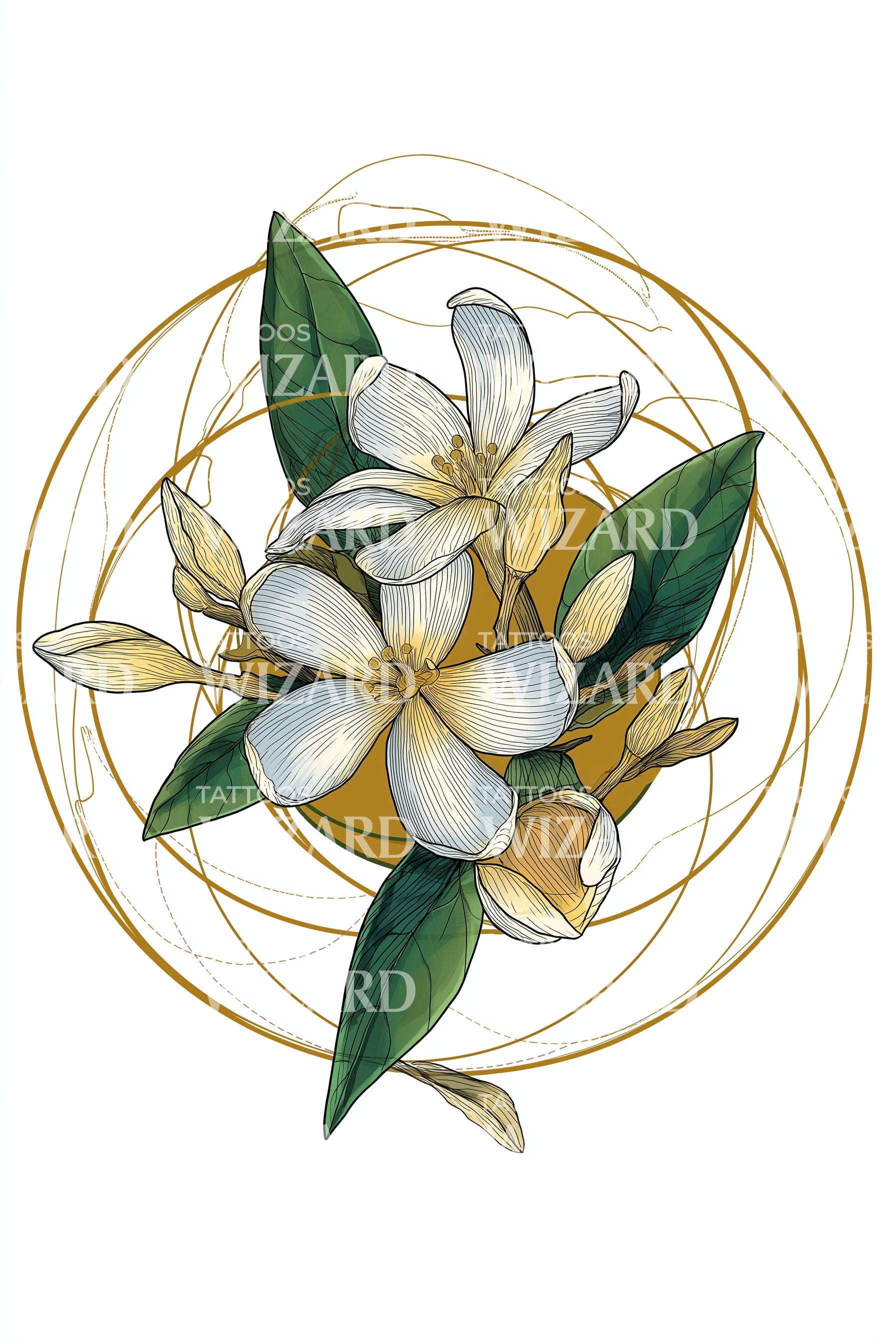 Diseño de tatuaje de Plumeria Órbita Dorada