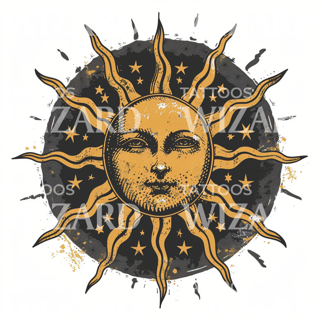 Libera a tu diosa interior con este diseño de tatuaje neotradicional, que demuestra intrincadamente poder y fuerza. Rebosante de energía radiante, el diseño de la reina del sol emana luz en trazos fascinantes: una verdadera encarnación de la mística femenina. Atrévete a brillar con esta impresionante pieza.