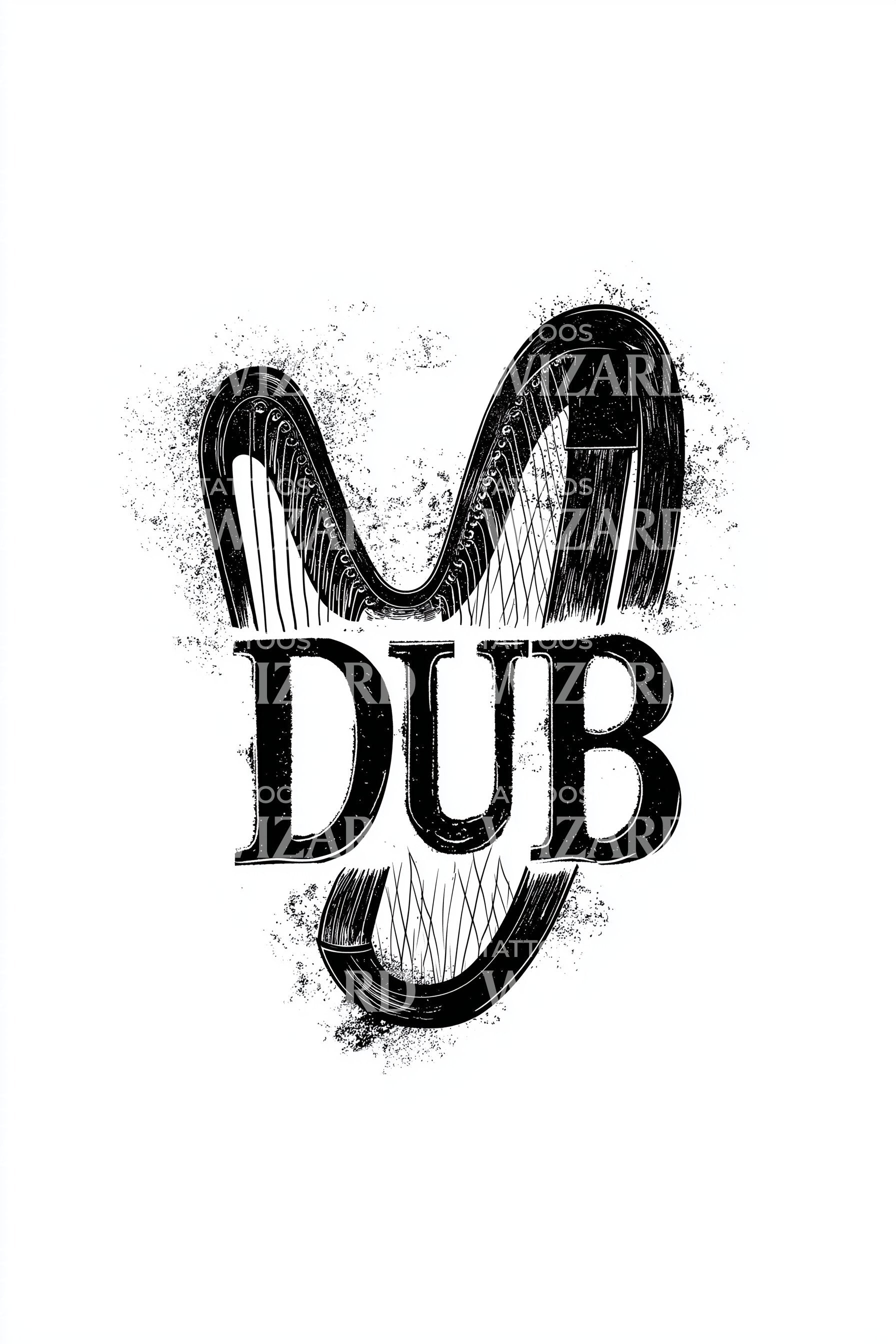 Fineline script and calligraphy curves sketch a harp-shaped monogram around bold DUB, flecked with gritty ink like city rain. The strings echo Dublin’s Beckett Bridge and Ireland’s emblem, tuning heritage to street rhythm. Worn on skin, it feels like home: lyrical, steadfast, quietly defiant, a heartbeat carried everywhere.