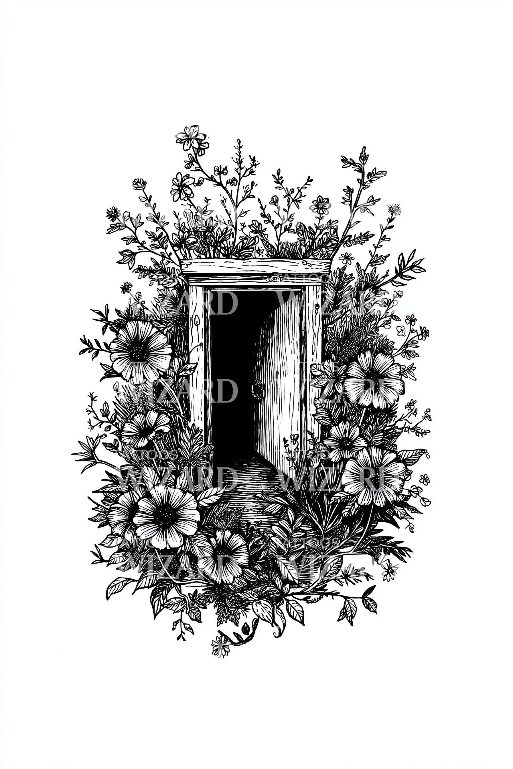 Presentamos un cautivador diseño de tatuaje blackwork, que muestra un portal místico y una puerta de sombras llenos de intrincados detalles botánicos. Esta pieza única, completamente en negro, une la belleza natural del follaje exuberante con el misterio inexplorado del reino de las sombras. Una ilustración llamativa para amantes del arte del tatuaje complejo y dramático.