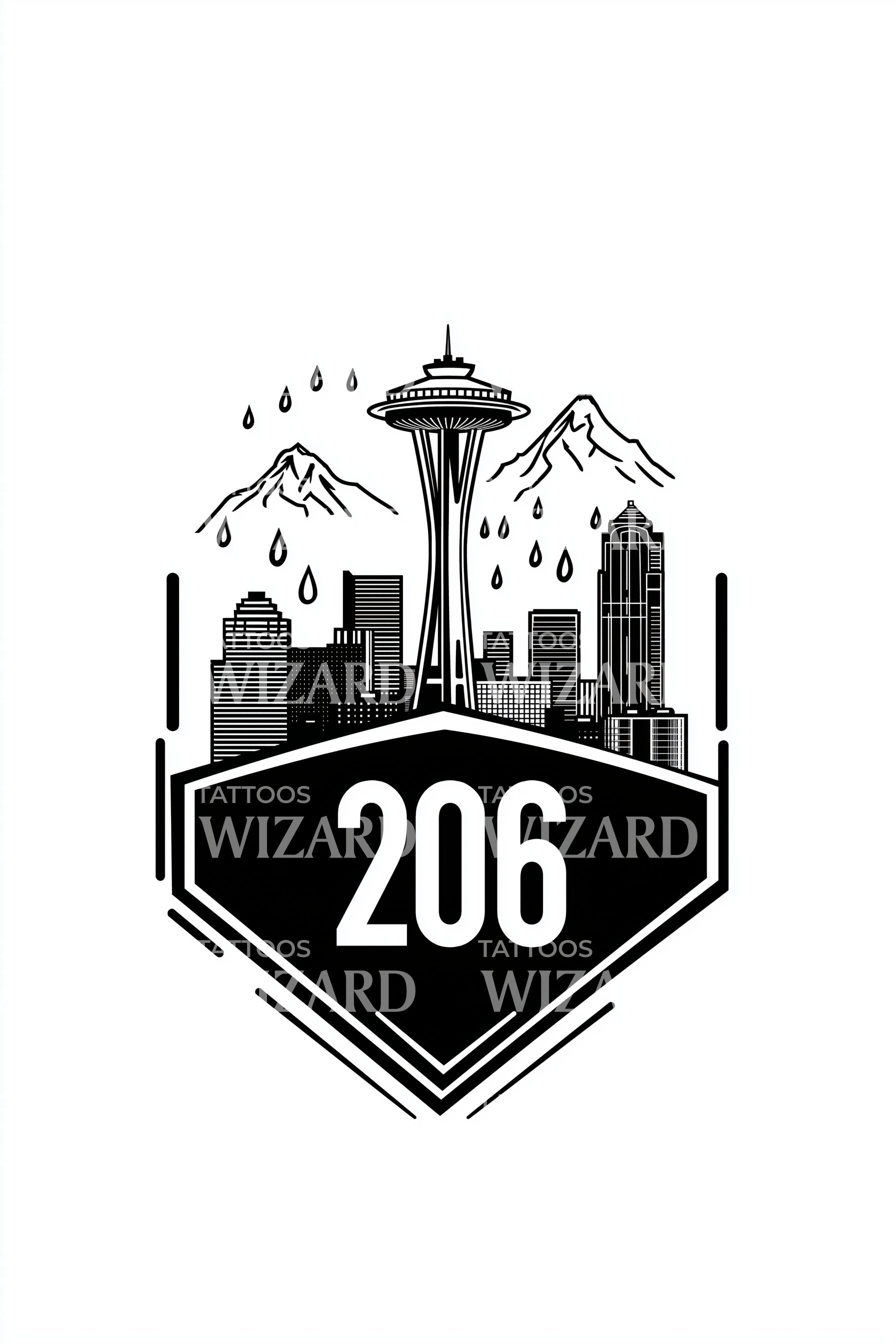 Geometric lines forge a monochrome shield, crowned by the Space Needle, flanked by snowy peaks and city blocks, raindrops suspended like notes. The 206 stands bold, a code of belonging. Symbol of resilience and rain-fed growth, this icon makes its wearer feel anchored, proud, quietly unstoppable, hopeful, always.