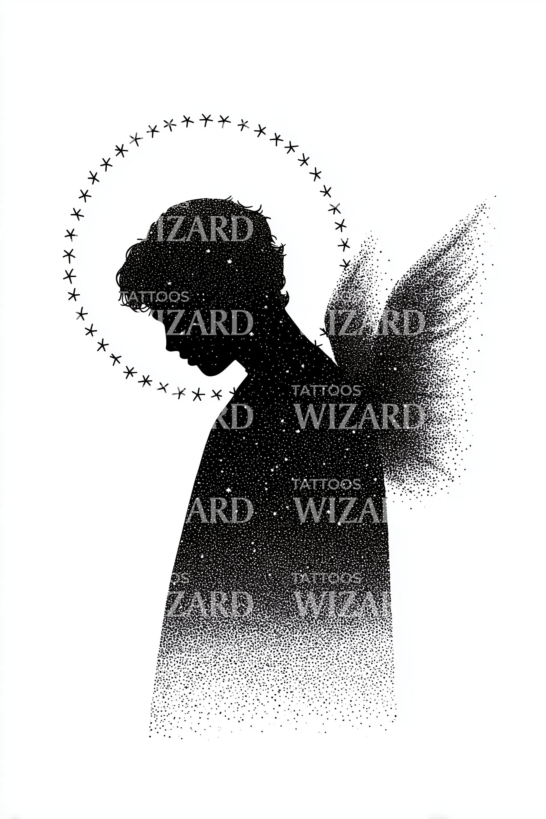 Dotwork constellations sculpt a bowed silhouette, circled by a starry halo and angelic wing rising from shadow. The figure becomes a quiet guardian, holding faith in the spaces between points of light. Worn on skin, it whispers protection, humility, and hope, carrying night-sky calm through every step.