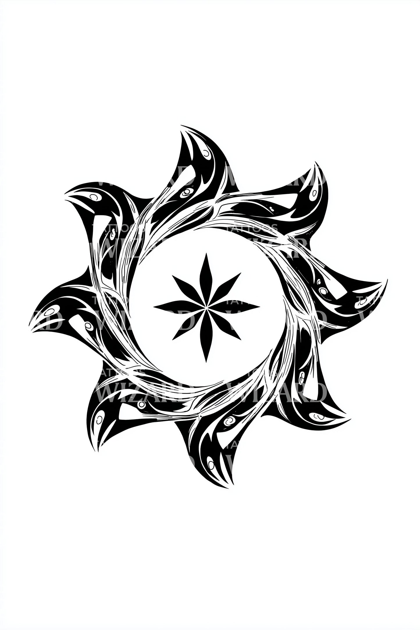 Este cautivador diseño de tatuaje tribal combina elementos solares y de corona en un círculo radiante armonioso. Representado en detallado blackwork, este diseño irradia poder y refleja la fuerza de los cuerpos celestes. Es una pieza evocadora, perfecta para quienes se sienten atraídos por estéticas tribales audaces.