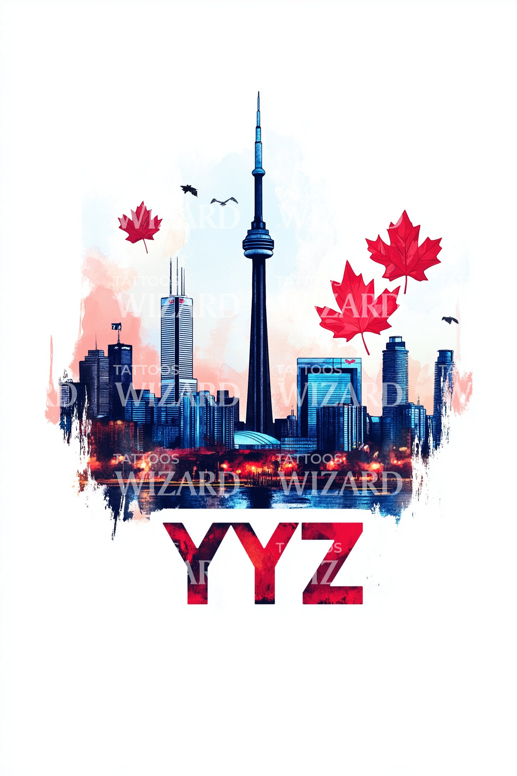Watercolor Toronto skyline washes in inky blues and ember reds, the CN Tower rising above mirrored lights as Canadian maple leaves drift across the sky. YYZ anchors piece, a gateway code for home and horizon. Worn on skin, it feels like rooted wanderlust, city pride, returning again, always.