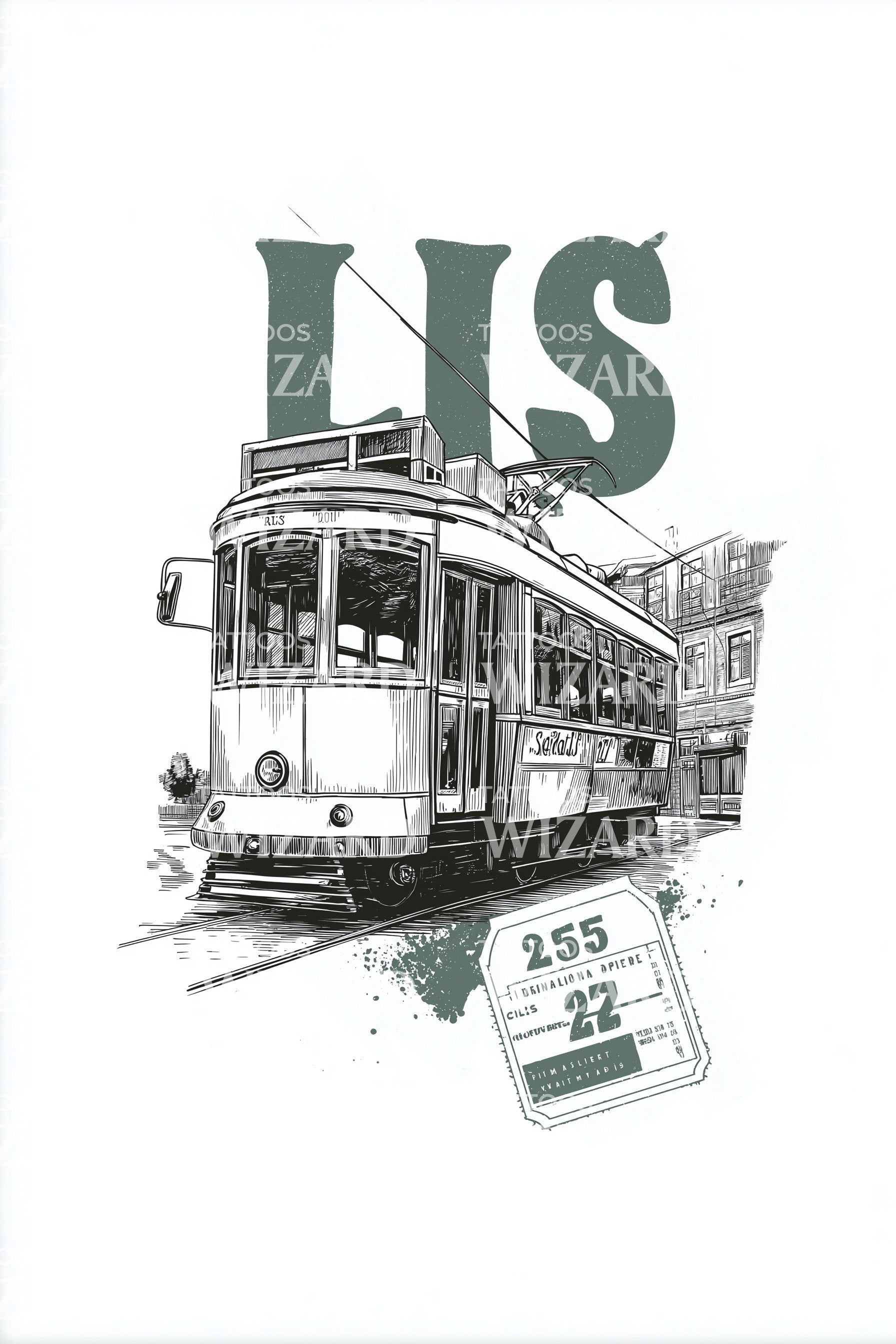Vintage linework captures a Lisbon tram beneath bold LIS lettering, splashed with postcard greens and a ticket-stamp accent. Symbolizes journeys, winding streets, and the promise of return. Worn on skin, it feels like motion, memory, and freedom, a quiet passport to everyday travel-joy. Rooted in saudade, personally resonant.