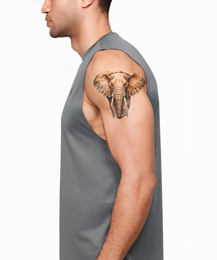 Experimente las proezas de la naturaleza africana con nuestro diseño de tatuaje de elefante en acuarela. Con una fascinante combinación de marrones terrosos y tonos de safari, esta interpretación artística captura la majestuosa belleza de uno de los animales más simbólicos de África. ¡Agrega un toque de naturaleza salvaje a tu colección de arte de la piel!