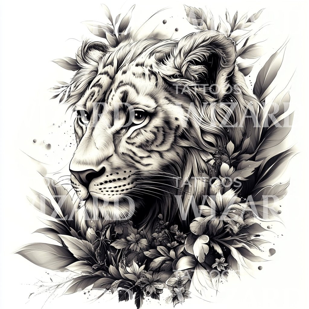 Desata tu lado salvaje con nuestro majestuoso diseño de tatuaje de león en negro y gris. Mostrando intrincados elementos florales entrelazados con un poderoso perfil de león acentuado en blanco, difumina las líneas entre la ferocidad y la serenidad de la naturaleza, haciendo una declaración impactante en cualquier entorno. Es hora de rugir con estilo.