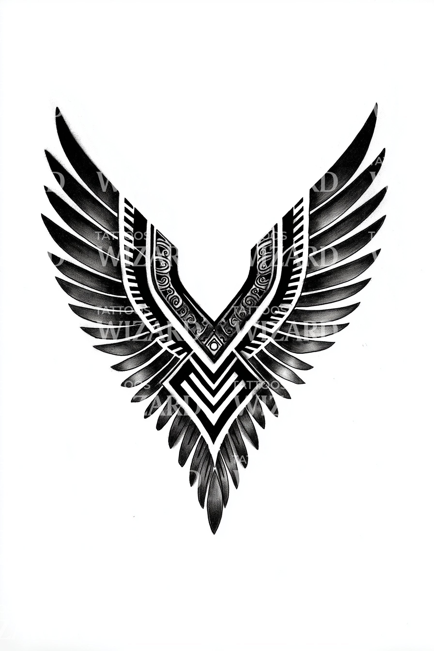 Geometric wings flare outward in bold blackwork, framing an angular V that locks into a shielded emblem. Clean lines and negative space forge modern symmetry. Wings speak of ascent and freedom, the shield of resilience. Worn close, the mark feels protective, decisive, and fiercely forward with quiet courage.