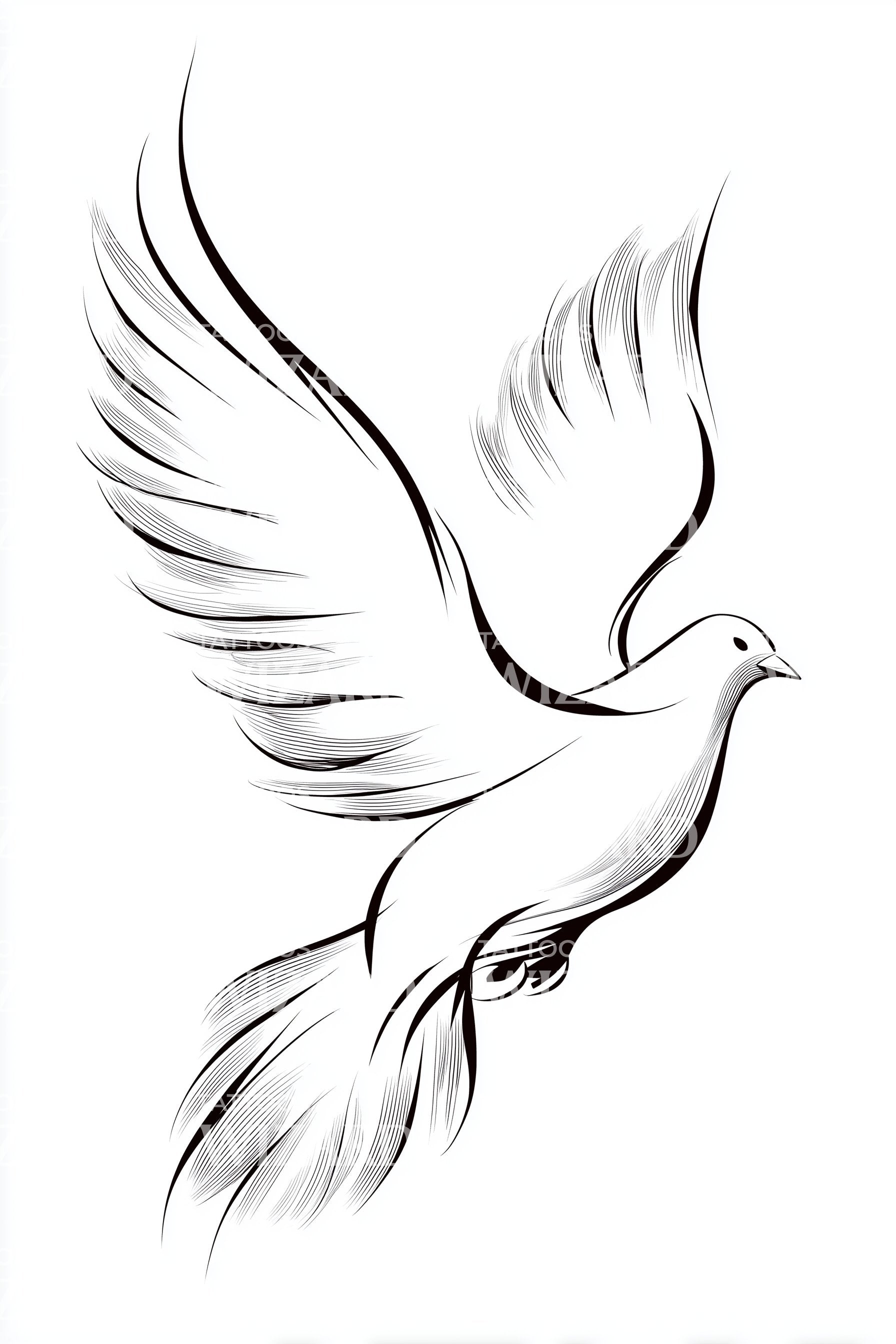 Tämä luonnos-tatuointisuunnittelu kuvaa kyyhkyä, rauhan, armon ja tyyneyden yleismaailmallista symbolia. Minimalistinen ääriviiva korostaa kyyhkyn majesteettista lentoa, luoden rauhallisen näkymän. Monipuolisella valkoisella sävyllä toteutettuna se säteilee eleganssia, joka sopii täydellisesti henkilökohtaisten esteettisten mieltymysten ilmaisemiseen. Lisää runollista kauneutta ihotaidekokoelmaasi tällä suunnittelulla.