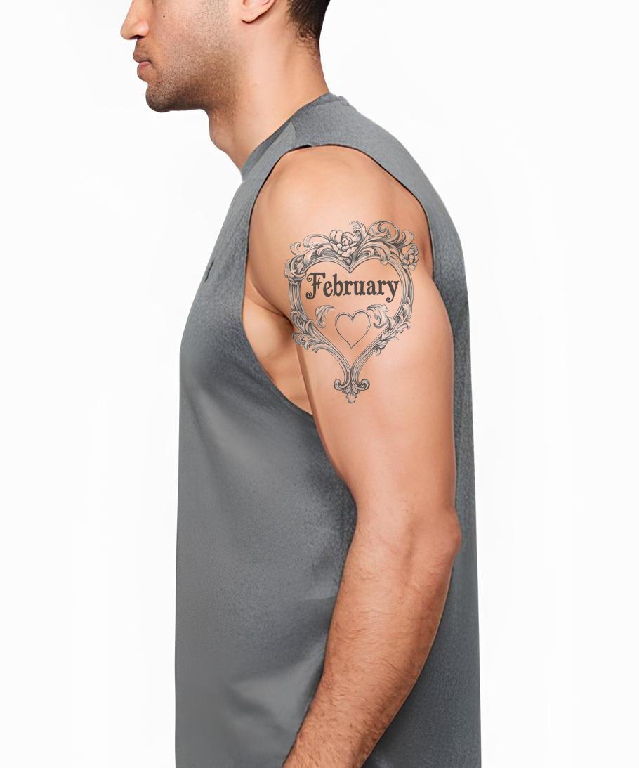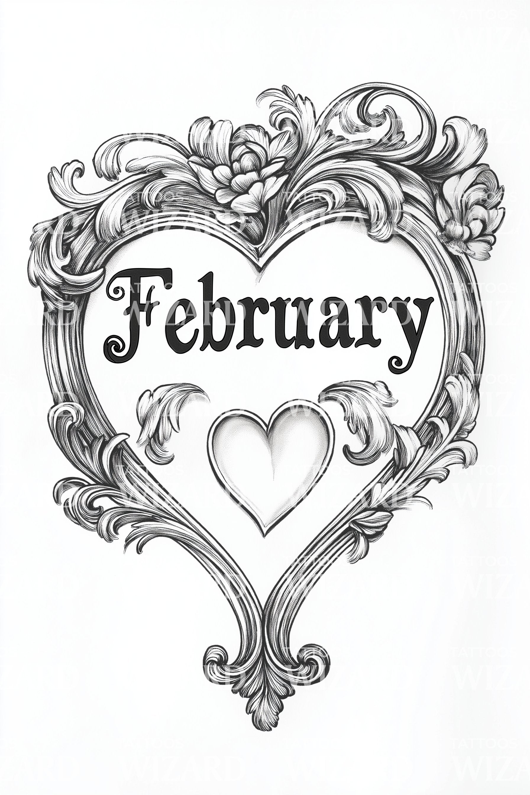 Baroque filigree curls into a heart-shaped frame, shaded in soft blackwork, cradling the word February and a luminous inner heart. Acanthus leaves and blossoms evoke antique romance and devotion. Symbolizing winter’s tender warmth, this design wraps the wearer in timeless love, ceremony, and personal vow, memory and grace.