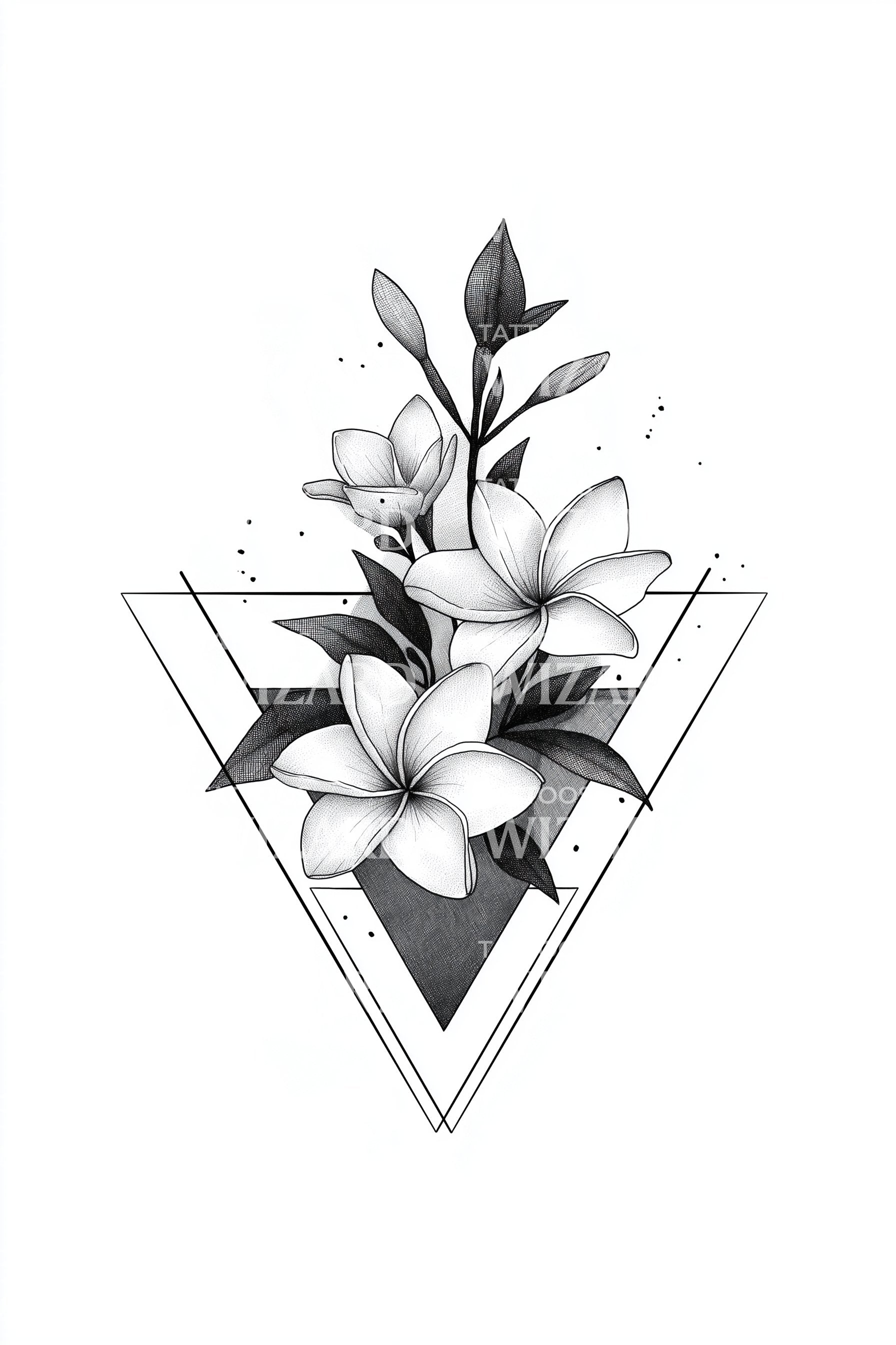 Sukella abstraktin taiteen maailmaan, jota tämä geometrinen tatuointisuunnittelu tarjoaa. Monikerroksinen ja pinottu, se esittelee kauniisti jasmiinikukan vangittuna vaikuttaviin kolmion kuvioihin. Tämä teos tasapainottelee luonnollisen ja matemaattisen välillä, yhdistäen kukkaisen eleganssin geometriseen tarkkuuteen – todella ainutlaatuinen lisä tatuointikokoelmaasi.