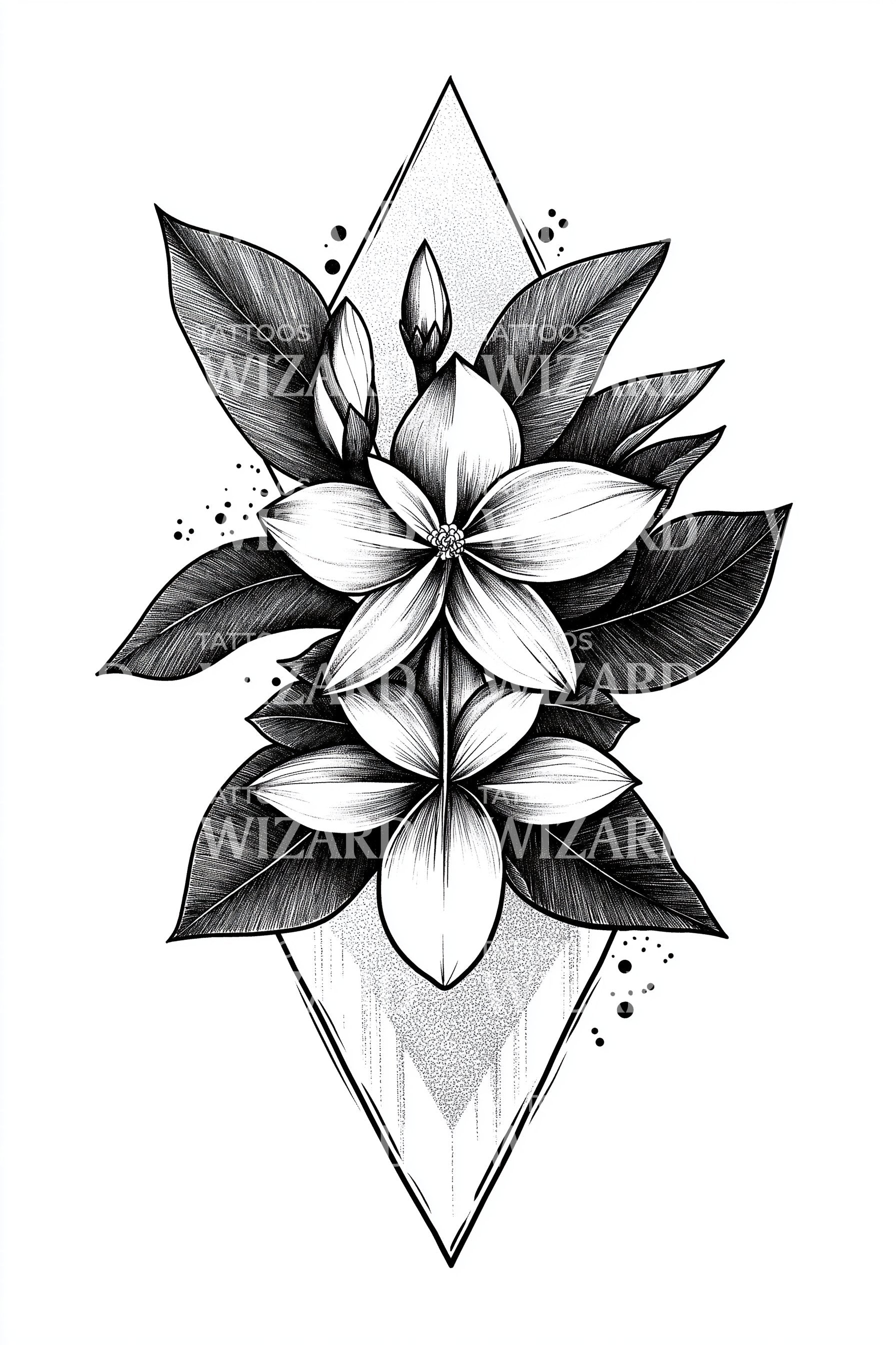 Löydä luonnon ja geometrian yhdistelmä tässä modernissa tatuointisuunnittelussa. Jasmiini, kuvattuna houkuttelevin viivoin, istuu keskittyneenä geometrisen timantin sisällä, ilmentäen vaikuttavaa tasapainoa. Tämä viivallinen tatuointisuunnittelu edustaa ainutlaatuista kukkaisen ja geometrisen estetiikan yhdistelmää, täydellinen nykyaikaiselle tatuointien ystävälle.