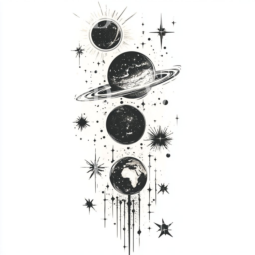 Sukella kosmiseen tyhjyyteen tämän mystisen tatuointisuunnittelun myötä. Käsityönä tehty yksityiskohtaisella pisteviivalla, se kuvaa tarkasti universumia ja sen taivaankappaleita. Syvän mustaan upotettuna se ulottuu planeetoista ratoihin, herättäen sisäisen avaruustutkijasi ja lisäten ainutlaatuisen esteettisen vivahteen.