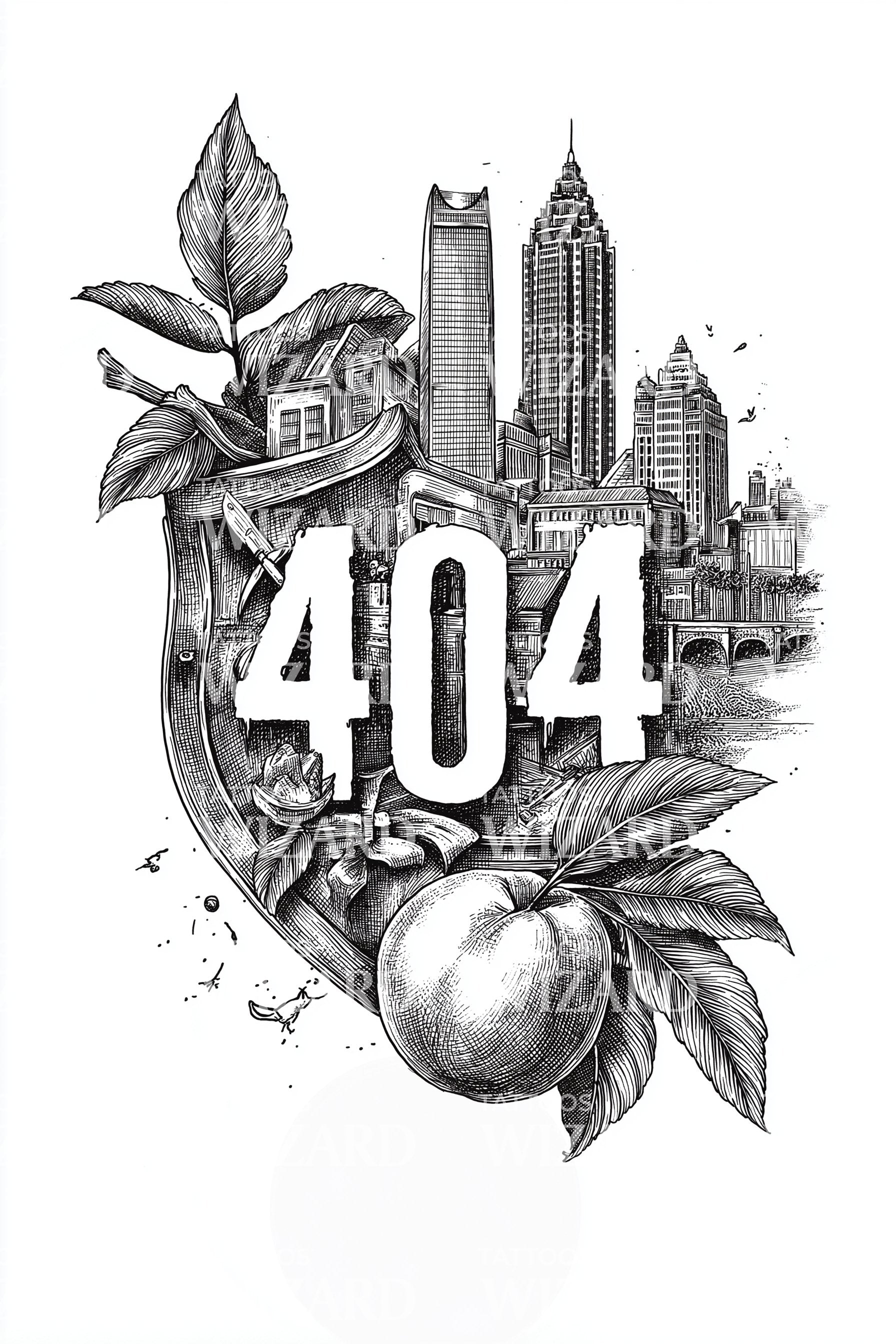 Hand-inked linework frames a bold 404, cradled by a ripe peach and leaves, with Atlanta’s skyline rising like steel orchards. The peach speaks Georgia roots; the towers, urban ambition; the number, home. Wear it for sweet resilience, city pride, and the pulse of the USA’s New South.