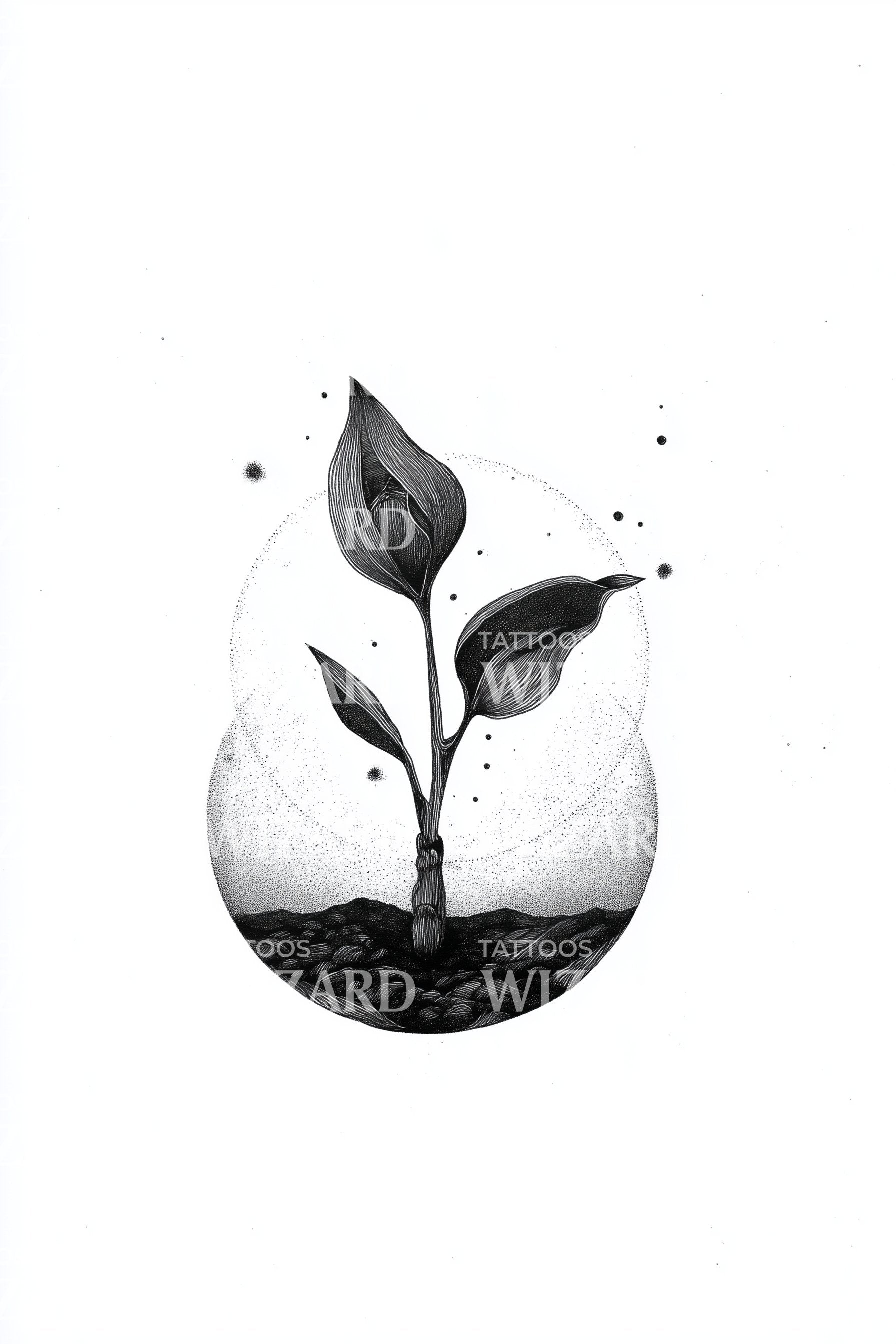 Seedling rises from textured earth, encircled by delicate dotwork halos and quiet stars. Fine-line leaves hold light and shadow, a living circle of nature’s breath. Symbolizes beginnings, grounding, and the eternal cycle of life and growth. Worn, it feels steady, hopeful, tenderly resilient, like soil warming the heart.