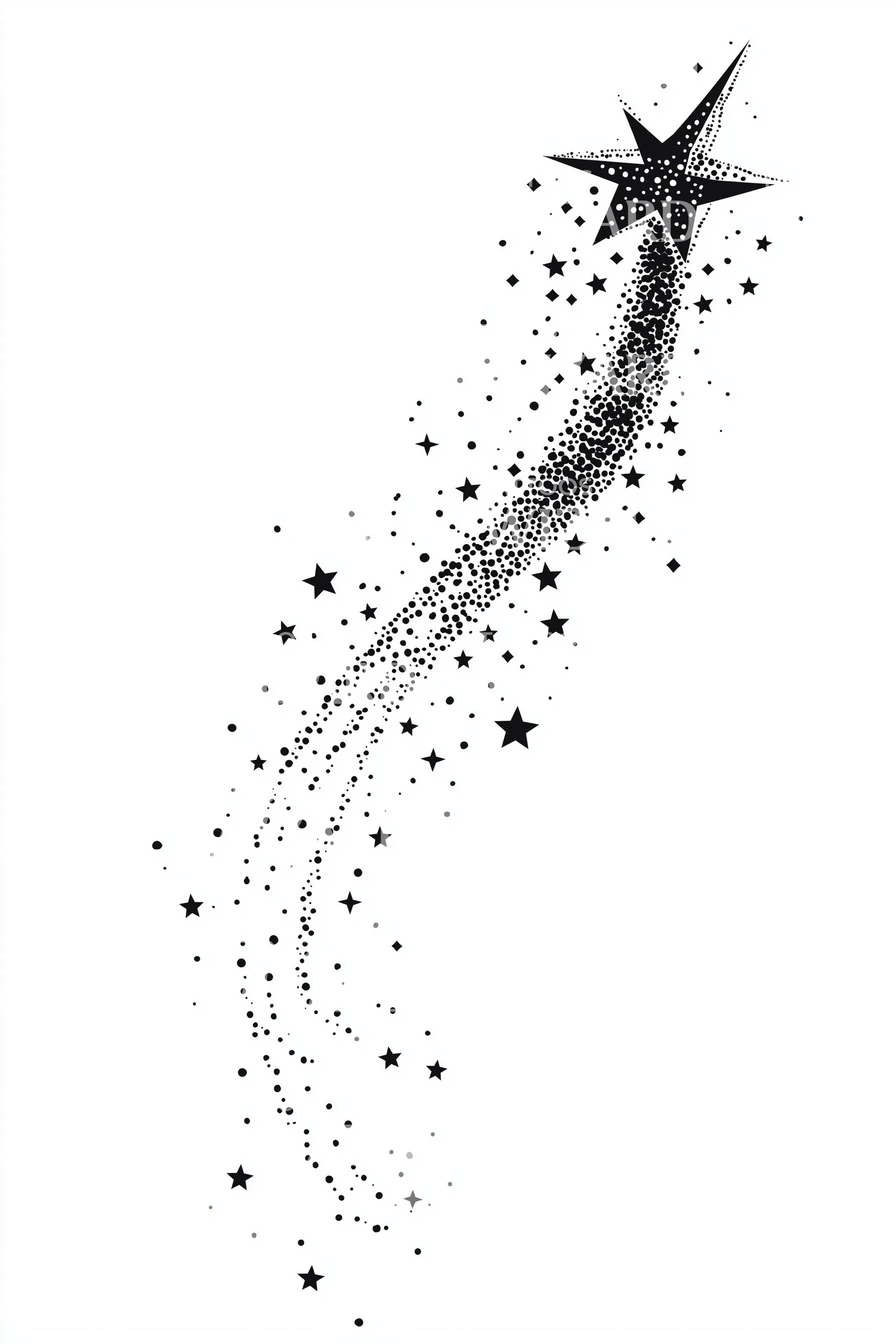 Sukella kosmisten ihmeiden maailmaan tämän ainutlaatuisen dotwork-tatuointisuunnittelun myötä. Se esittää eteerisen tähdenlennon, joka kulkee loistavasti hienovaraisesti pisteytetyn avaruuden halki. Taivaan, tähtien ja toiveiden yhdistäminen yhdeksi ainutlaatuiseksi teokseksi on todellinen kunnianosoitus universumin loputtomalle kauneudelle.