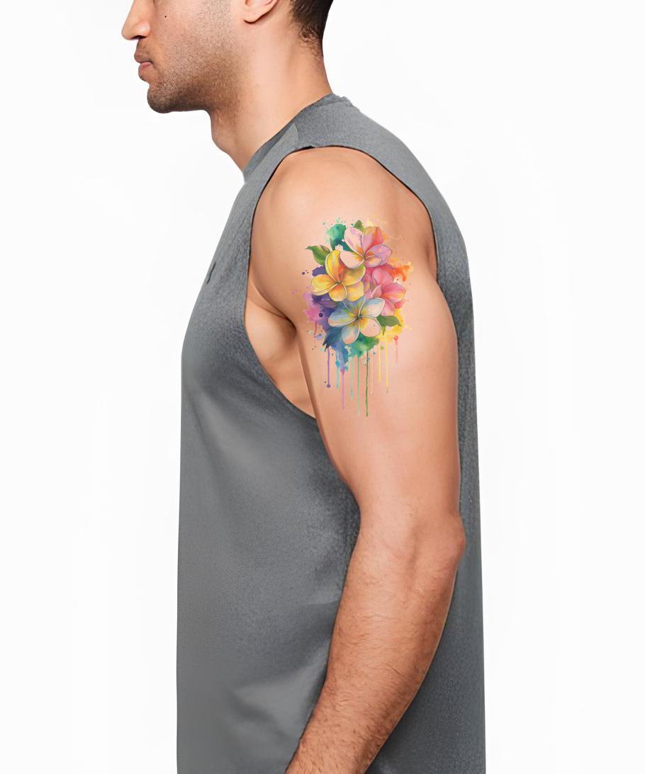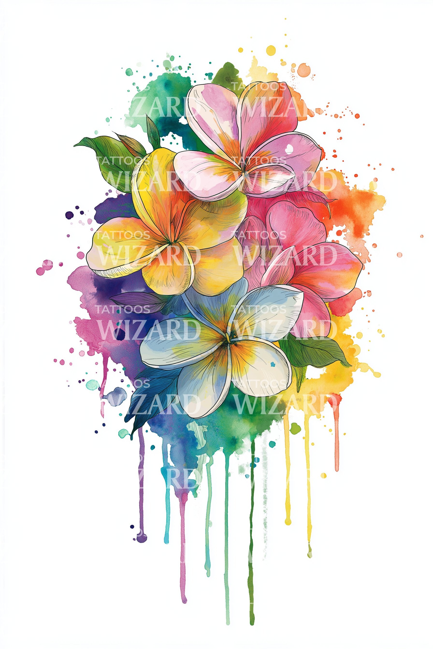Anna itsesi uppoutua tämän vesivärityylisen tatuointisuunnittelun taiteellisuuteen. Käyttämällä elävän spektrin sävyjä kukkaryhmässä, se sulauttaa kauniisti värit ja tekstuurin. Kukka-aihe, joka on kehystetty herkällä valumakuviolla, tarjoaa intensiivisen, kuuman vivahteen tatuointien ystäville. Eloisa mestariteos ihollesi!