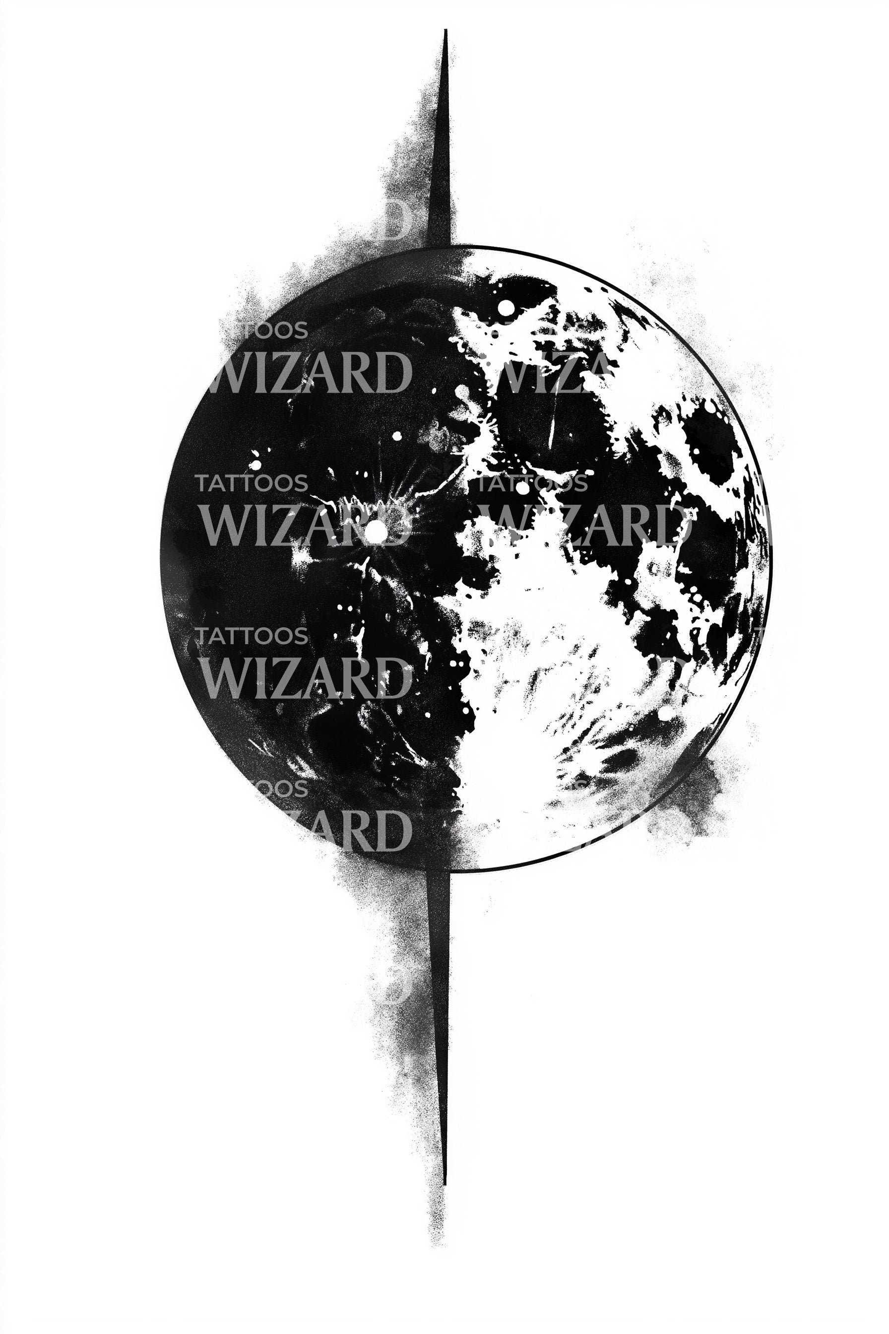 Blackwork moon split in stark halves, cratered texture breathing in black and white, pierced by a vertical sliver of shadow. Contrast charts tides of change, light meeting void, cycles within space. Wearing it feels like steady gravity and quiet rebellion, a reminder to balance mystery with clarity.