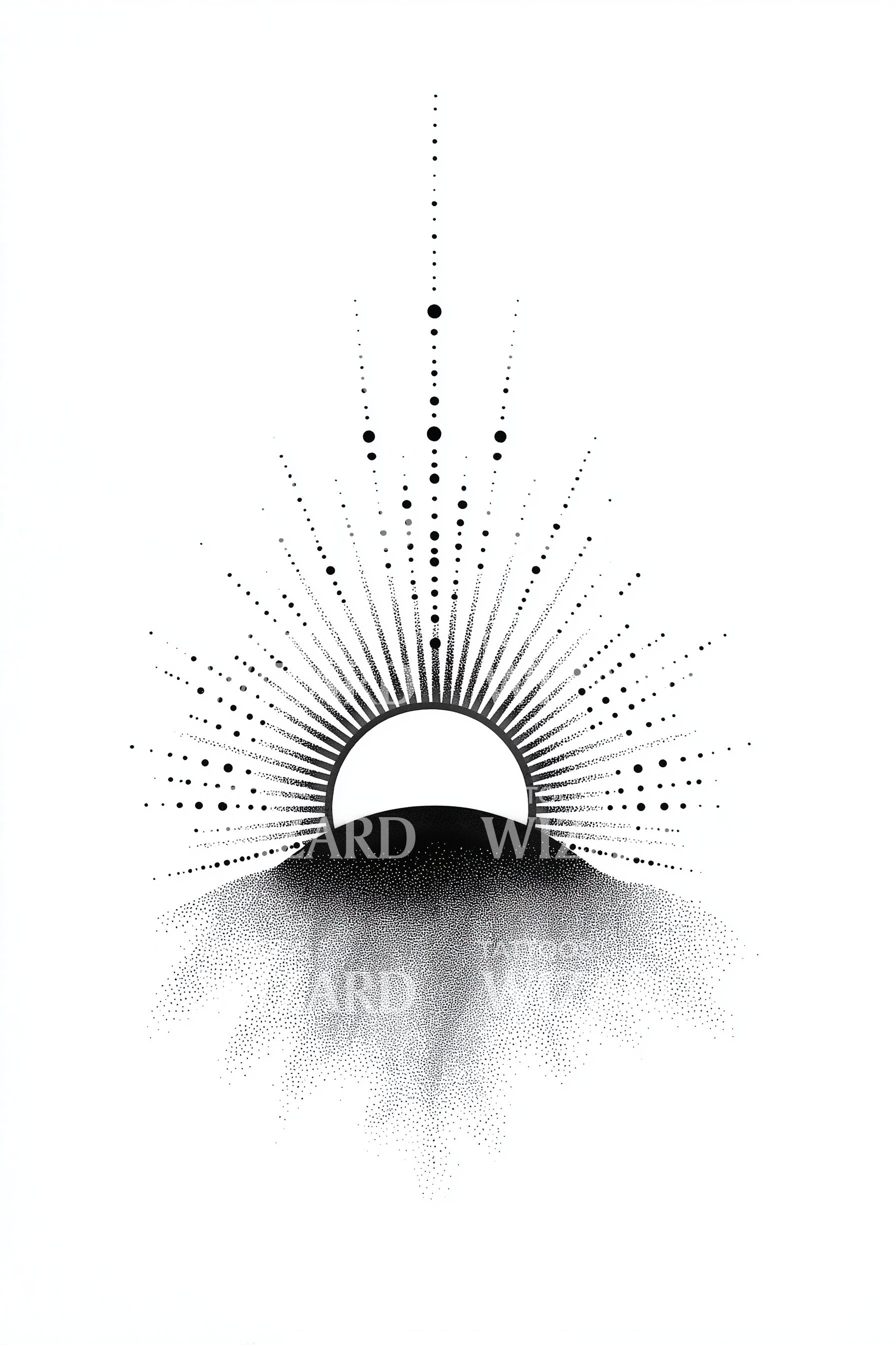 Minimal dotwork sun lifts from a soft horizon, rays fanning into a celestial dotburst while dusted dots cascade below. Symbolizing renewal and steady ascent, it honors daily cycles and quiet strength. Wear for calm clarity and grounded optimism, a gentle reminder that light returns and beginnings persist always.