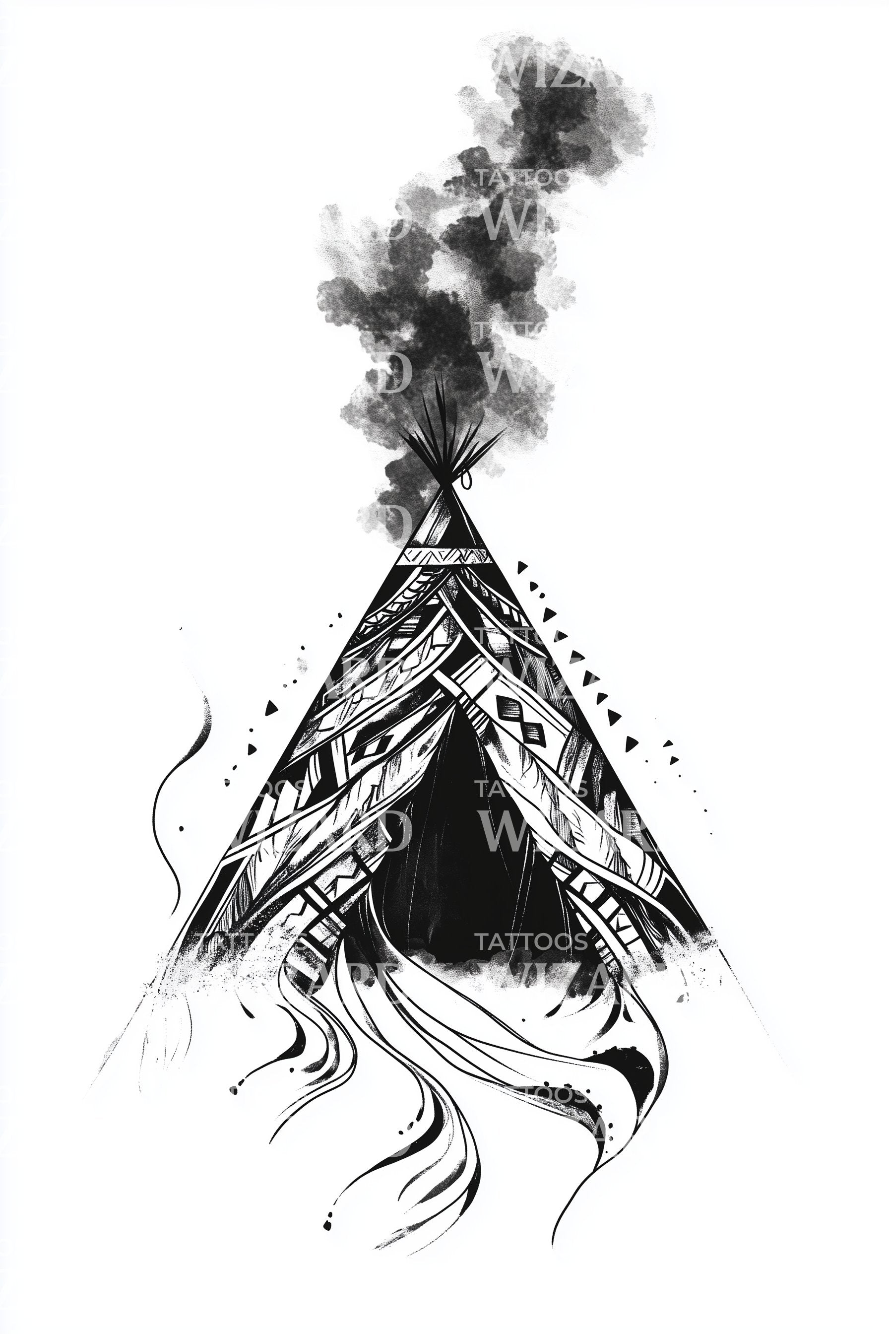 Blackwork teepee rises with bold tribal geometry, smoky watercolor plumes, and dancing ink trails. Symbol of camp and kin, the shelter cradles quiet fire while the smoke carries spirit and memory skyward. Wearing it feels grounded yet nomadic, a vow to honor heritage and homeward paths.