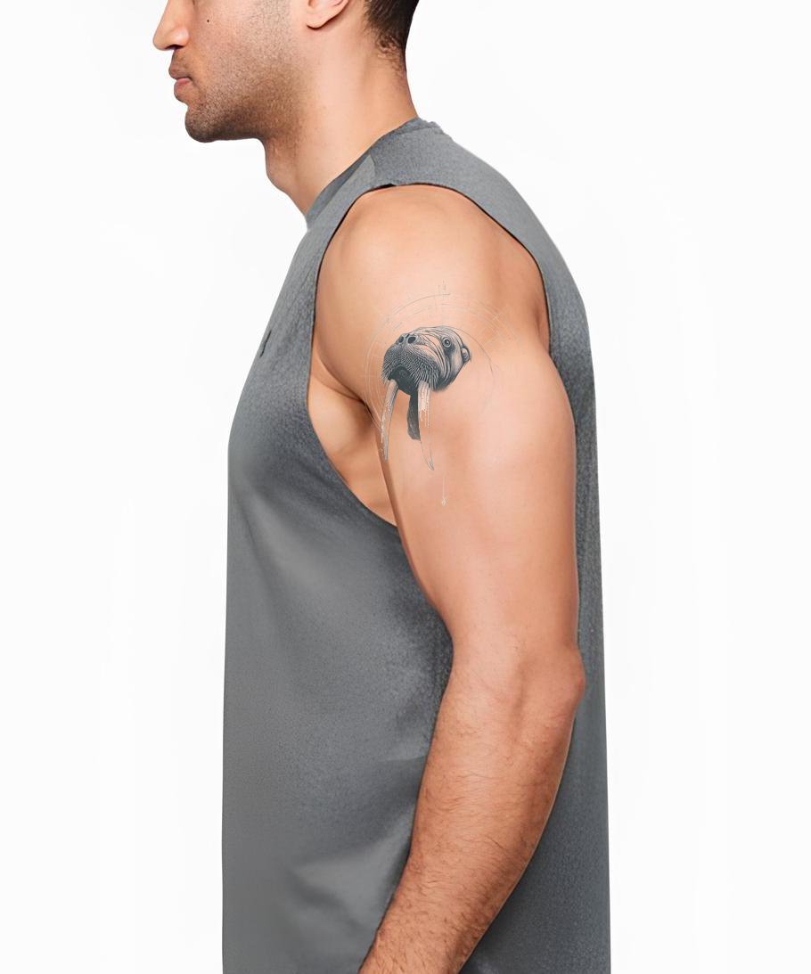Majestic walrus portrait rendered in crisp linework and dot shading, framed by celestial charts and compass rings. Cosmic and marine unite, tusks like lunar crescents. Symbolizes endurance, guidance, and ancestral memory of the sea. Wearing it feels grounded, star-guided, quietly powerful, an explorer between tides and constellations, awake.
