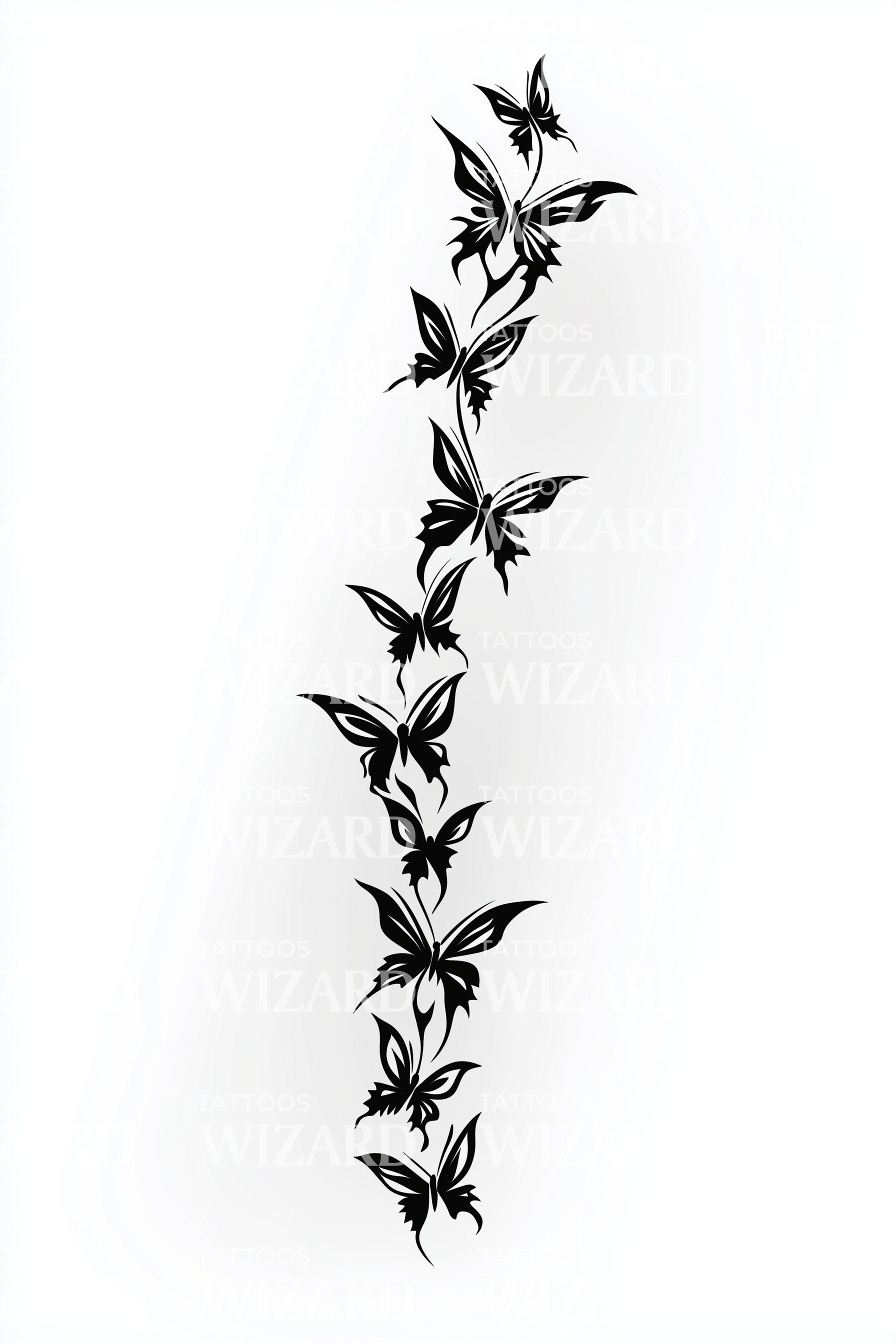 Ce tatouage en forme de sentier vertical mêle avec finesse l'art du blackwork à des éléments de la nature. Il présente un papillon captivant déployant ses ailes au milieu d'un motif délicat de vigne, baignant l'ensemble dans une esthétique florale. Une représentation parfaite de la transformation et de la croissance pour les amoureux de la nature.