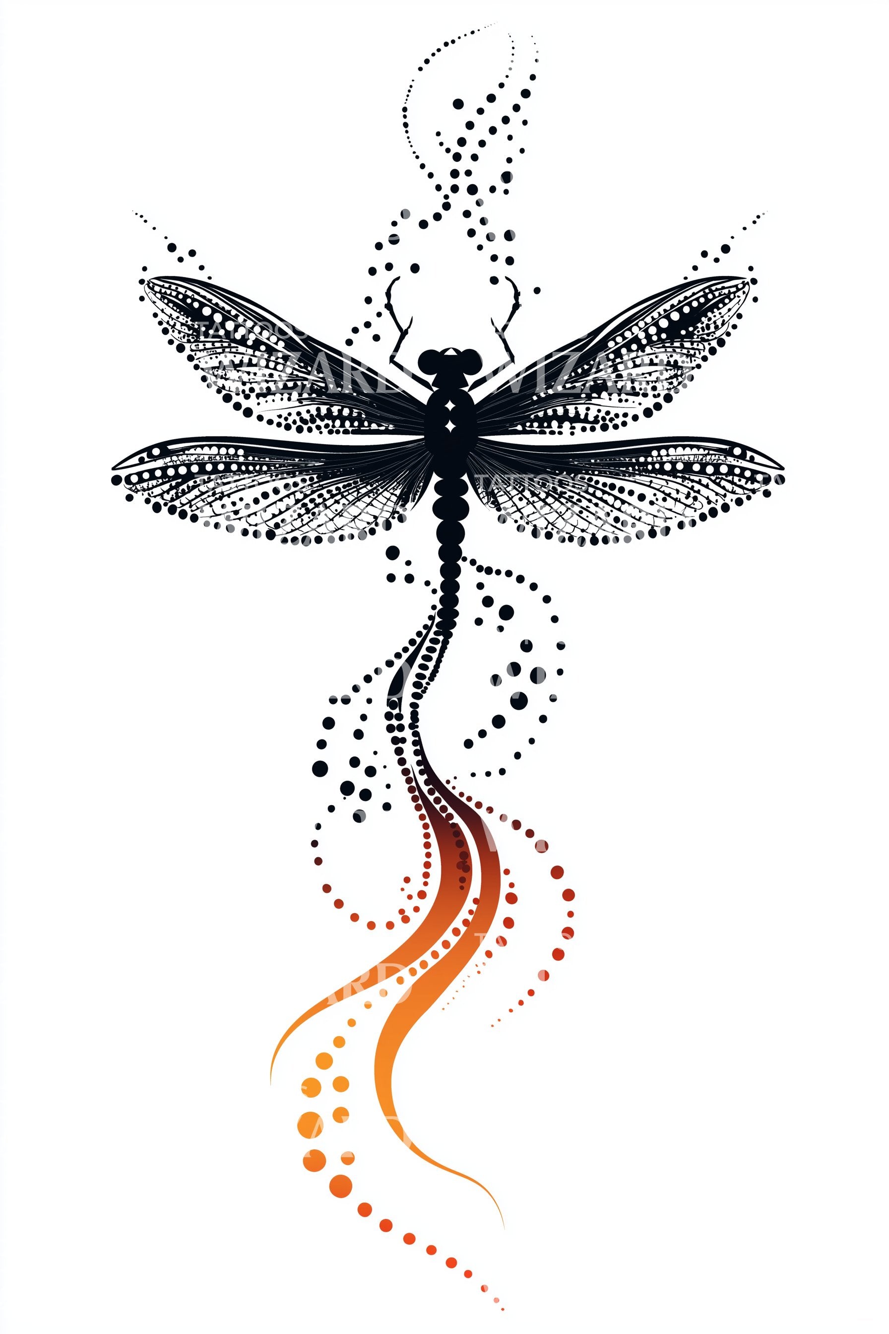 Dotwork dragonfly spreads lacework wings, while a ribbon of ember-bright tail curls below, scattering glowing sparks. Symbol of transformation and lightness of being, it rises from embers to remind that change births grace. Wearer feels lifted, warm with inner glow, moving forward with brave calm and steady poise.