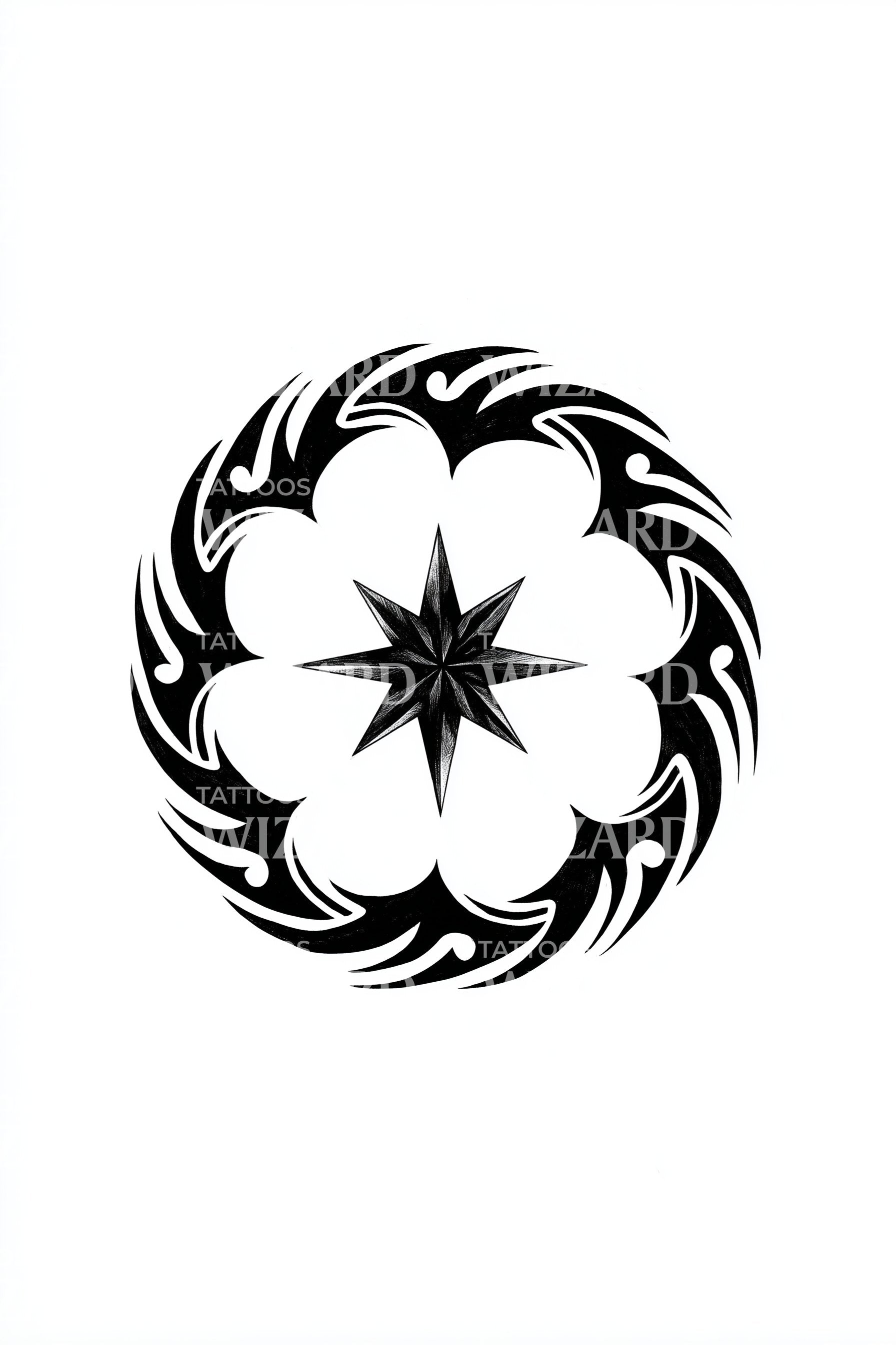 Impressionnez avec ce motif de tatouage tribal, affichant un blackwork saisissant. Des symboles sacrés, dont un soleil radieux et un halo enflammé, se mêlent harmonieusement à des motifs tribaux. Le centre est une bague élégante enflammée par une flamme cascade. Idéal pour ceux qui recherchent des tatouages audacieux avec une touche spirituelle.