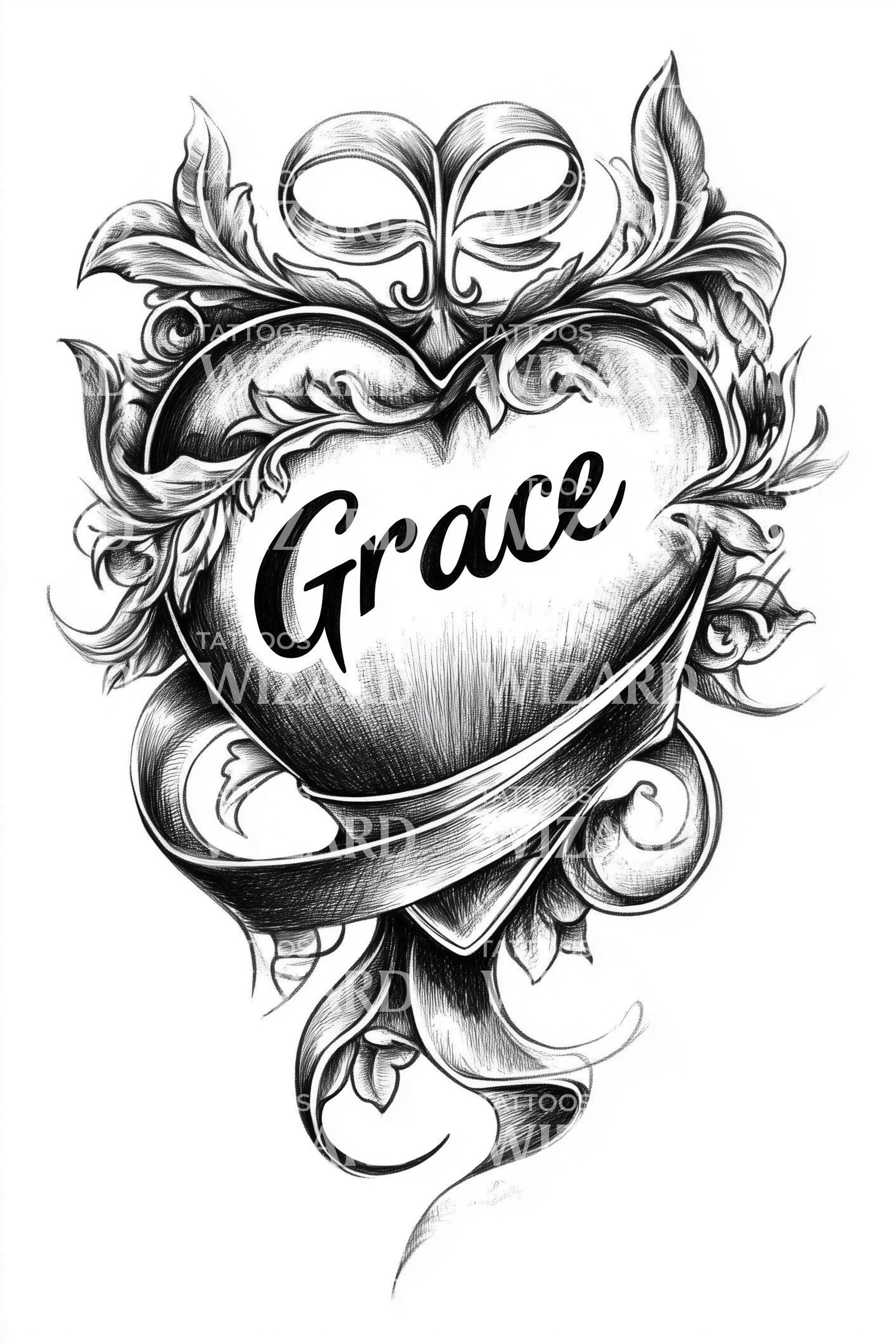 Plongez dans le charme de l'art oldschool avec ce design de tatouage captivant. S'inspirant des thèmes symboliques de la grâce, de l'amour et de la foi, il présente un cœur classique enveloppé d'une bannière artistique. C'est une pièce intemporelle qui allie esthétique traditionnelle et spiritualité profonde. Parfait pour tout amateur de tatouage !