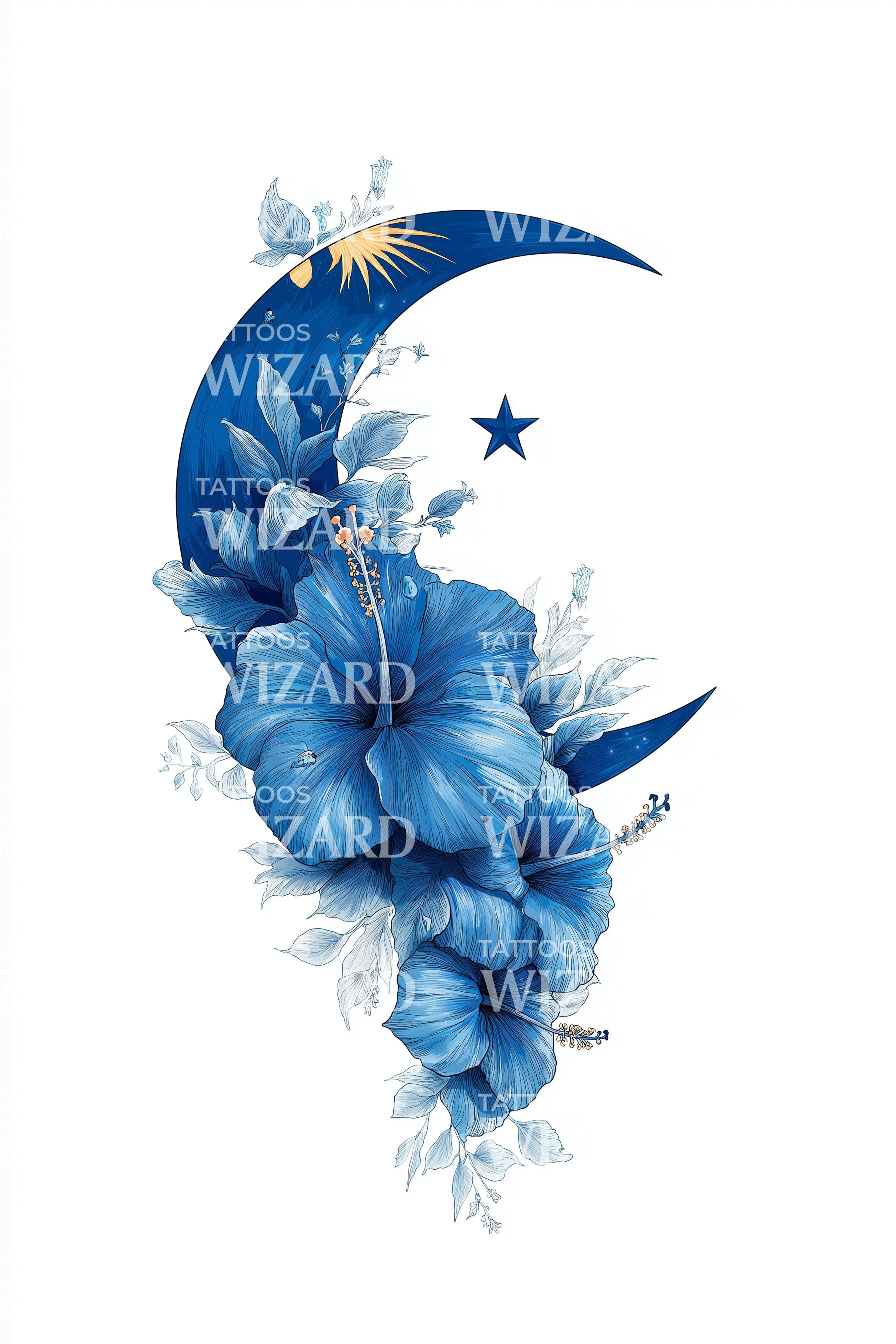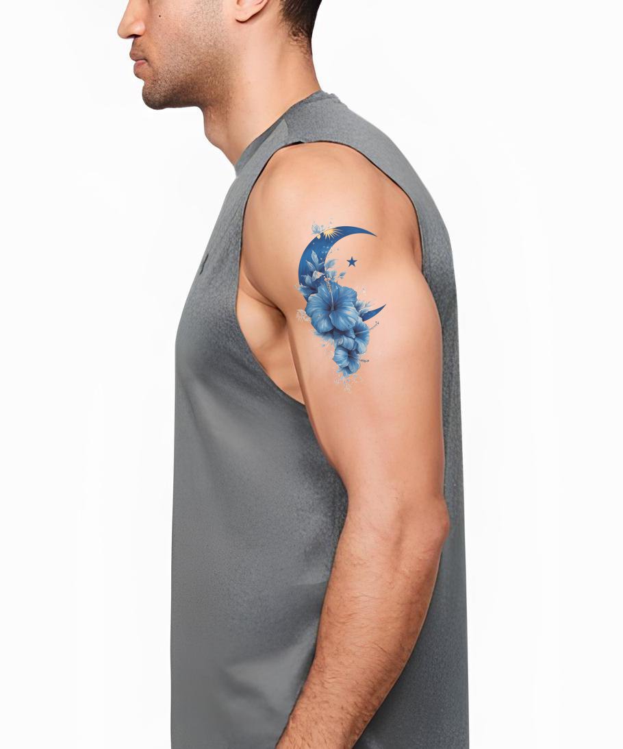 Célébrez l'élégance malaisienne avec ce tatouage aquarelle : un croissant bleu serein berce des fleurs d'hibiscus vibrantes, dont les pétales se dissolvent en lavis oniriques et étoiles scintillantes. Des dégradés fluides et des contours doux créent une aura florale délicate — polyvalente pour l'avant-bras, l'épaule ou la cheville — symbolisant la beauté, la guidance et le calme lunaire — ainsi qu'un héritage céleste — toujours avec grâce.