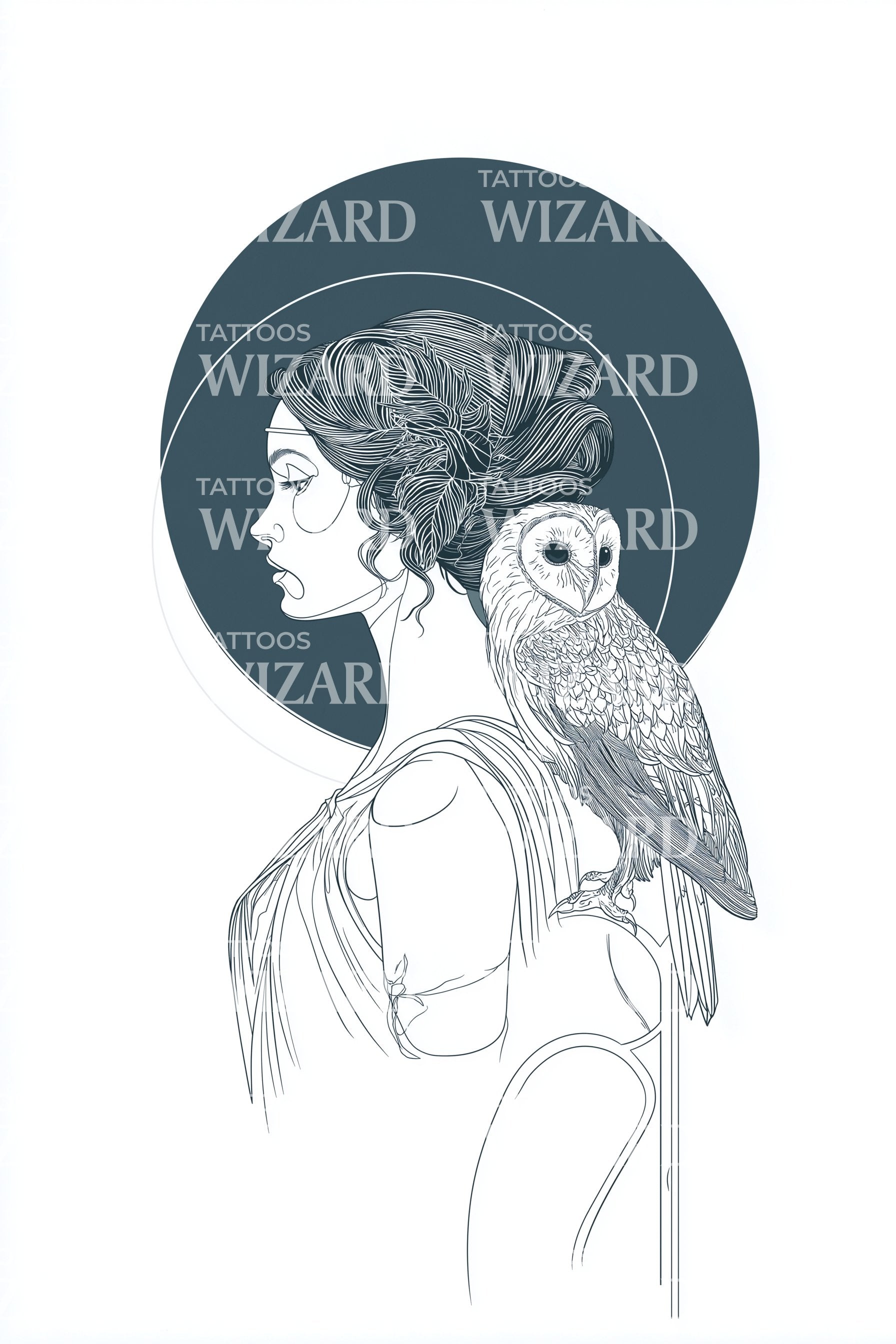 Portrait camée néotraditionnel : une dame rétro en profil serein, lignes drapées et halo lunaire, une chouette attentive sur son épaule. Symbolisant la sagesse, l'intuition et la protection, il évoque ce courage tranquille que vous portez. Idéal sur le haut du bras, la cuisse, le mollet ou le dos, s'adaptant à son ovale élancé et son cercle rayonnant.
