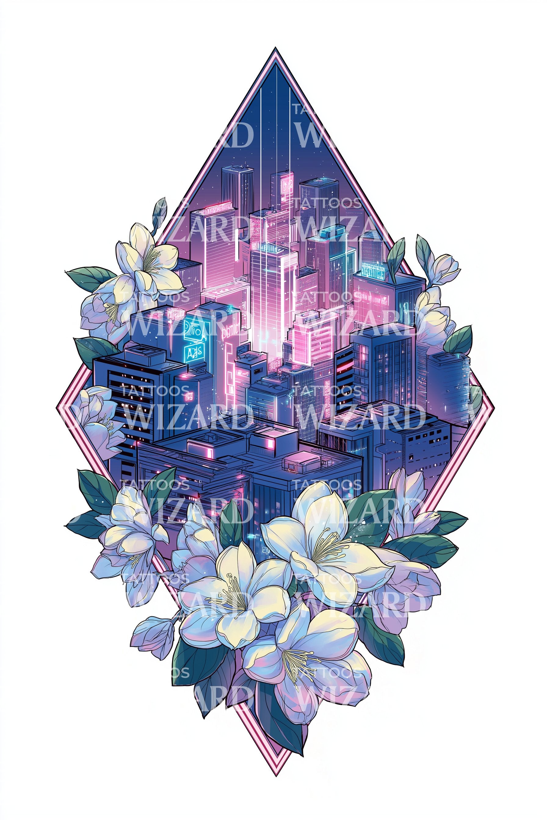 Adoptez l'urbanité et la beauté avec notre tatouage géométrique, conçu avec expertise pour fusionner la silhouette urbaine avec des éléments floraux naturels. Taillé avec la précision d'un diamant et touché par la teinte sublime du violet, c'est un mélange harmonieux de charme métropolitain et d'élégance organique.