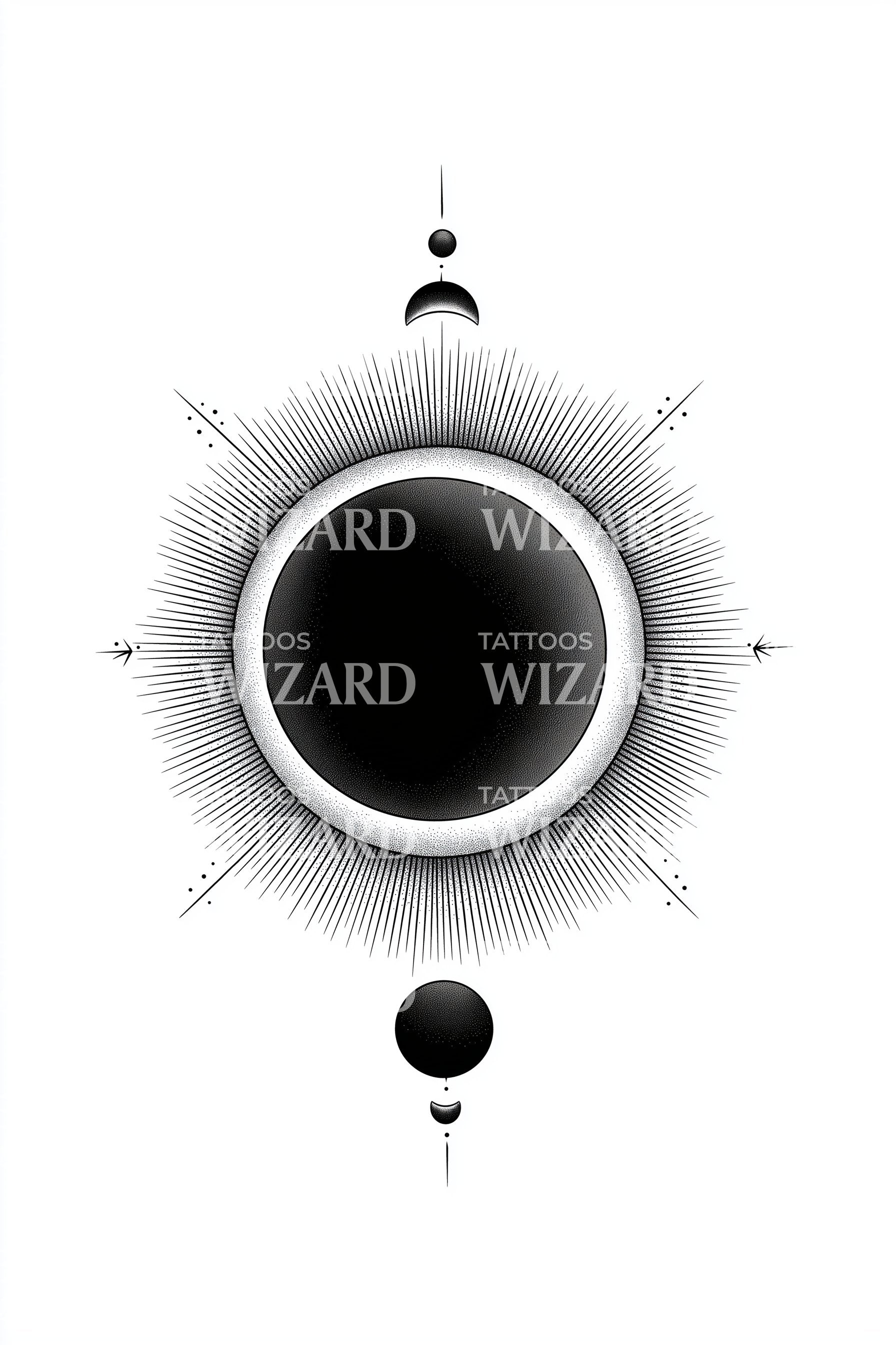 Blackwork solar eclipse crowned by a luminous halo, needle-fine rays radiate from a velvet void. Orbital dots and crescents chart quiet trajectories, mapping cycles of shadow and return. Symbol of rebirth and cosmic alignment, it carries steady courage, calming the pulse with space-borne awe and radiant stillness.