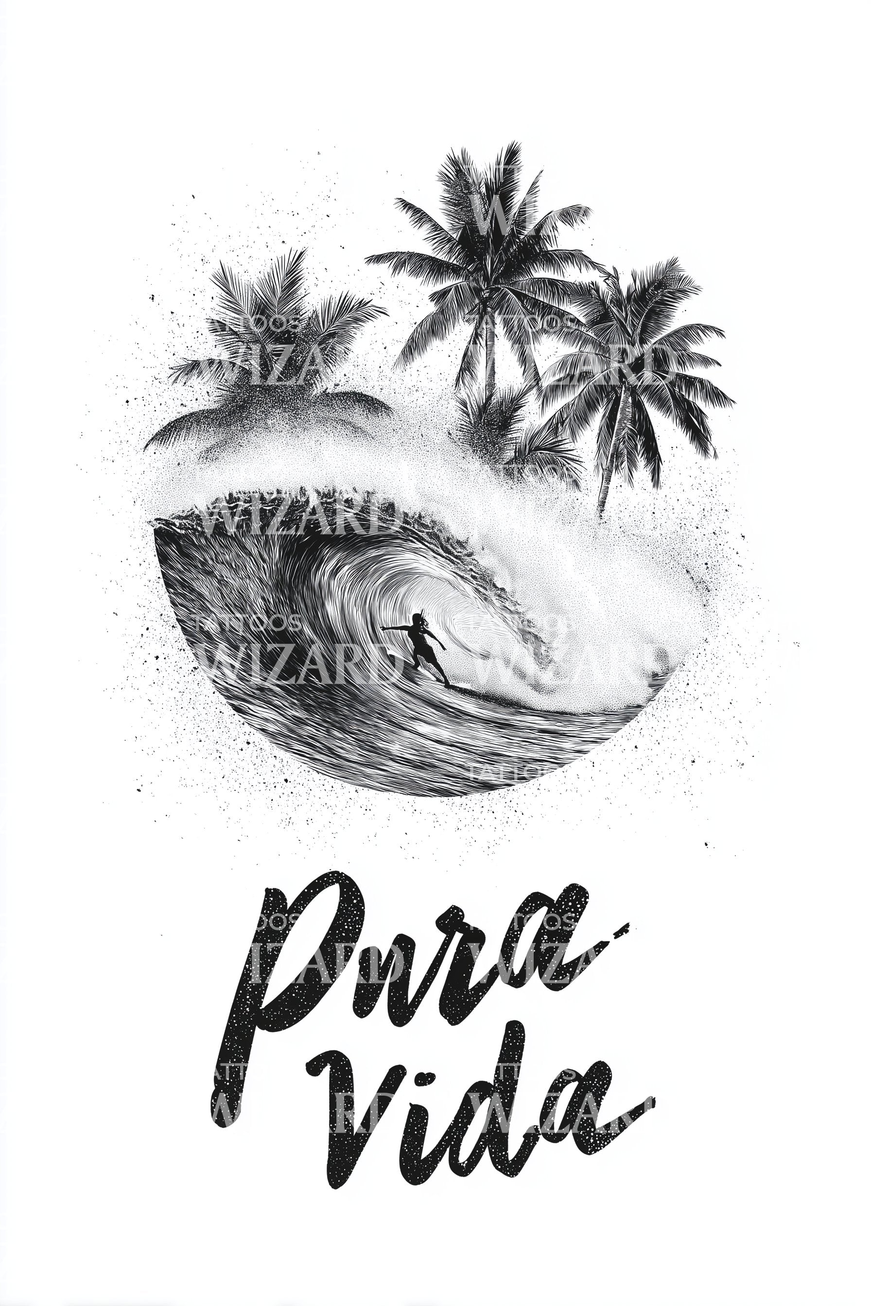 Salt-kissed sketchwork captures a monochrome barrel, a lone rider framed by wind-brushed palms and drifting spray, beneath the hand-lettered Pura Vida. The wave symbolizes surrender to flow, the palms wanderlust and safe harbor. Worn daily, it whispers ocean calm, fearless travel, and unshakable freedom, under open, endless skies.