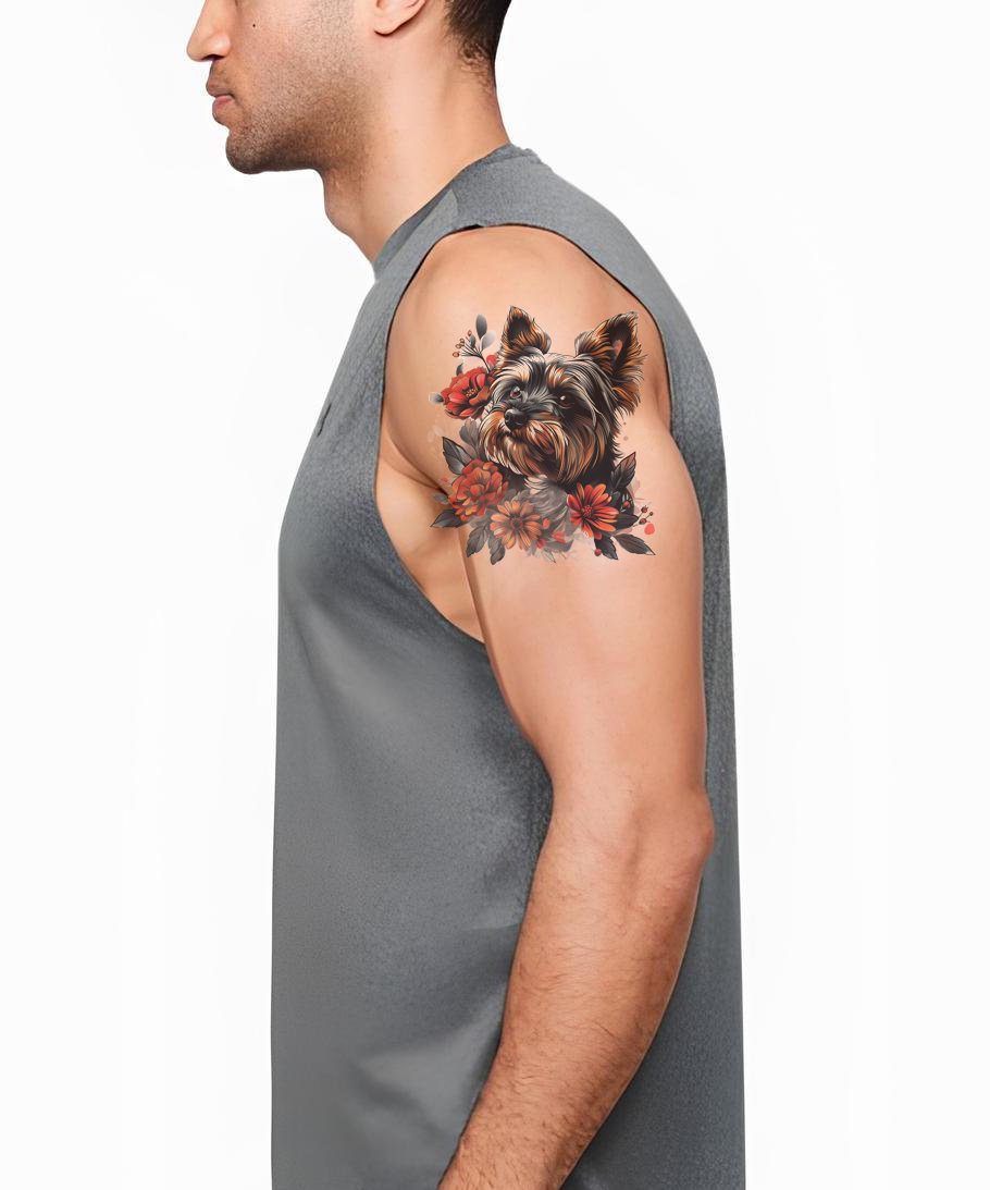 Découvrez l'amour inconditionnel et la loyauté de votre animal Yorkshire avec notre design de tatouage illustratif néo-traditionnel. Ce portrait de chien unique, encadré de délicates fleurs, capture l'essence de votre ami à fourrure, élevant son statut d'animal de compagnie à œuvre d'art. Parfait pour honorer votre compagnon le plus fidèle.