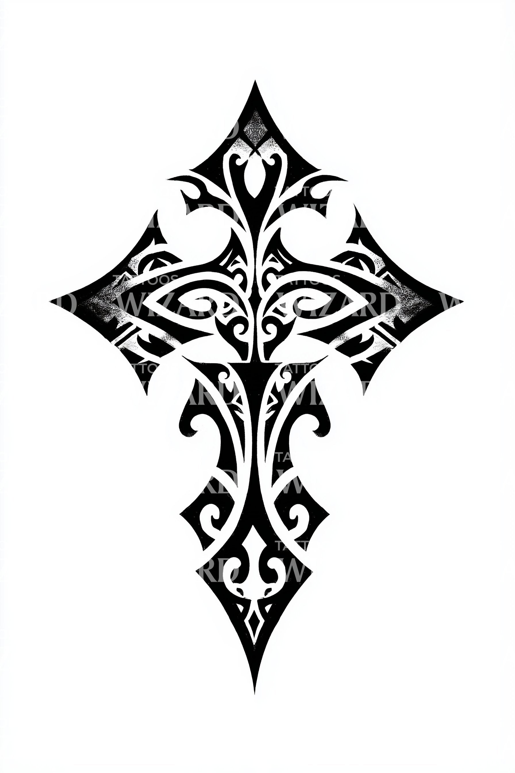 Ez a fekete törzsi tetoválás dizájn éles, markáns esztétikát sugároz. Félelem nélkül ötvözi a hit elemeit, melyeket egy szimbolikus kereszt ábrázol. A törzsi minták és a gyémánt alakú központ egyedi keveréke a kitartás élét adja hozzá. Kifejezetten azoknak készült, akik értékelik a finomság és a hangsúlyosság kettősségét tintájukban.