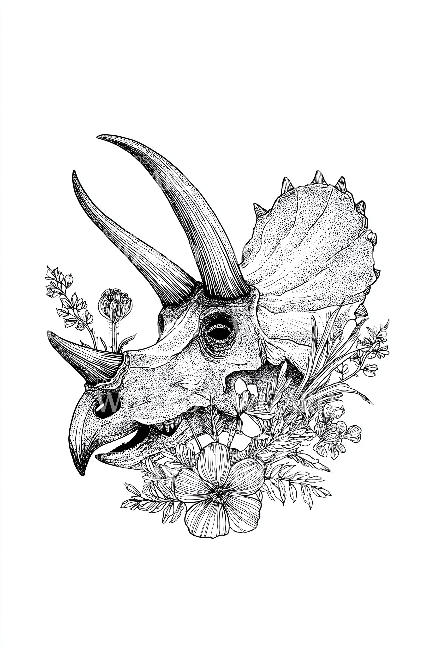 Floral Triceratops Skull Tattoo Illustration