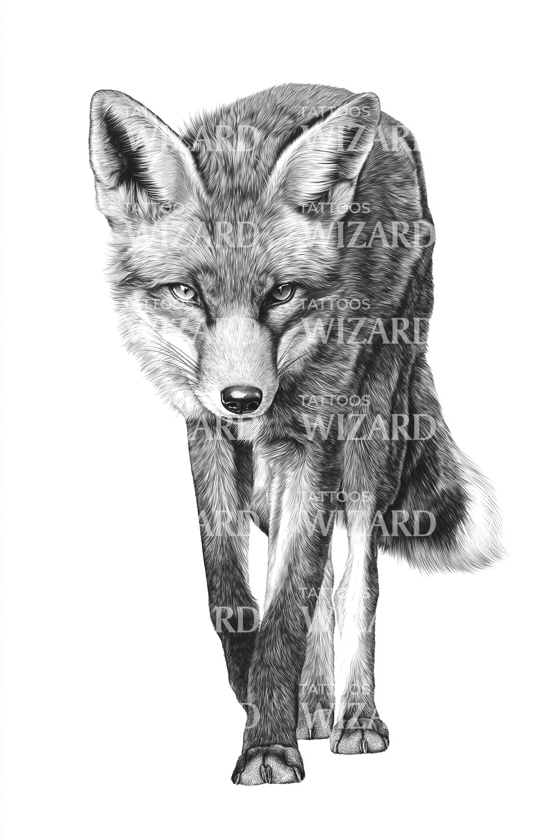 Monochrome fur rendered in fine black&grey, a fox steps forward, eyes narrowed in a quiet, relentless prowl. Symbol of intuition, adaptability, and cunning survival, it carries the wild’s watchful wisdom. Wearing it feels like moving through shadows with calm focus, sovereign grit, and untamed purpose at your core.