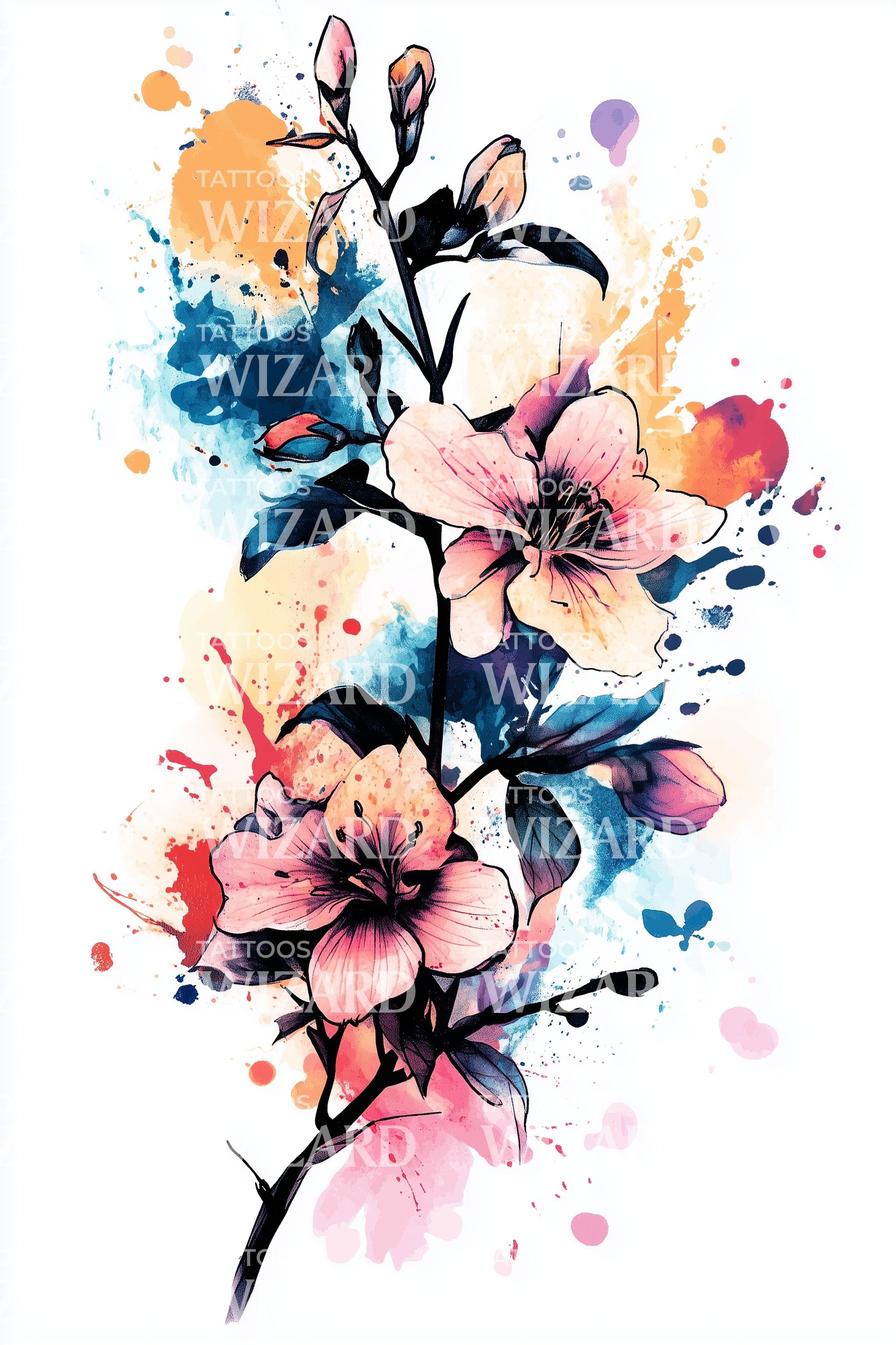 Ez az elegáns tetoválásminta megragadja a leomló magnólia virágok kifinomult szépségét egy ágon. Finom rózsaszín árnyalatokból álló, játékos akvarell stílusban készült, a tetoválás a természet saját eleganciájának és erejének átalakító hatalmát testesíti meg. Tökéletes a kecsesség és a fejlődés megjelenítésére.