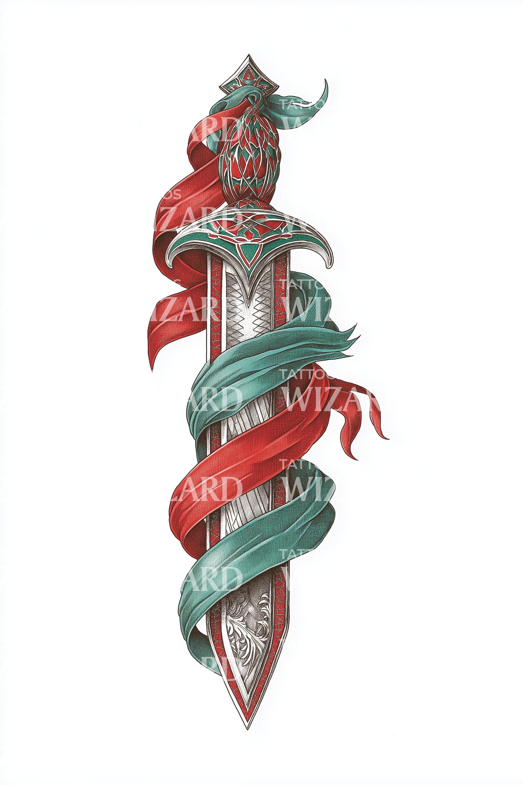 Mutasd meg iráni büszkeséged ezzel az illusztratív tetoválásmintával. A tinta egy bonyolult kardot ábrázol, amelyet egy lobogó szalag teker körbe, az iráni zászlót jelképezve. A domináns zöld és piros árnyalatok az ország erejét és kitartását szimbolizálják – lenyűgöző tisztelgés Irán gazdag öröksége előtt.