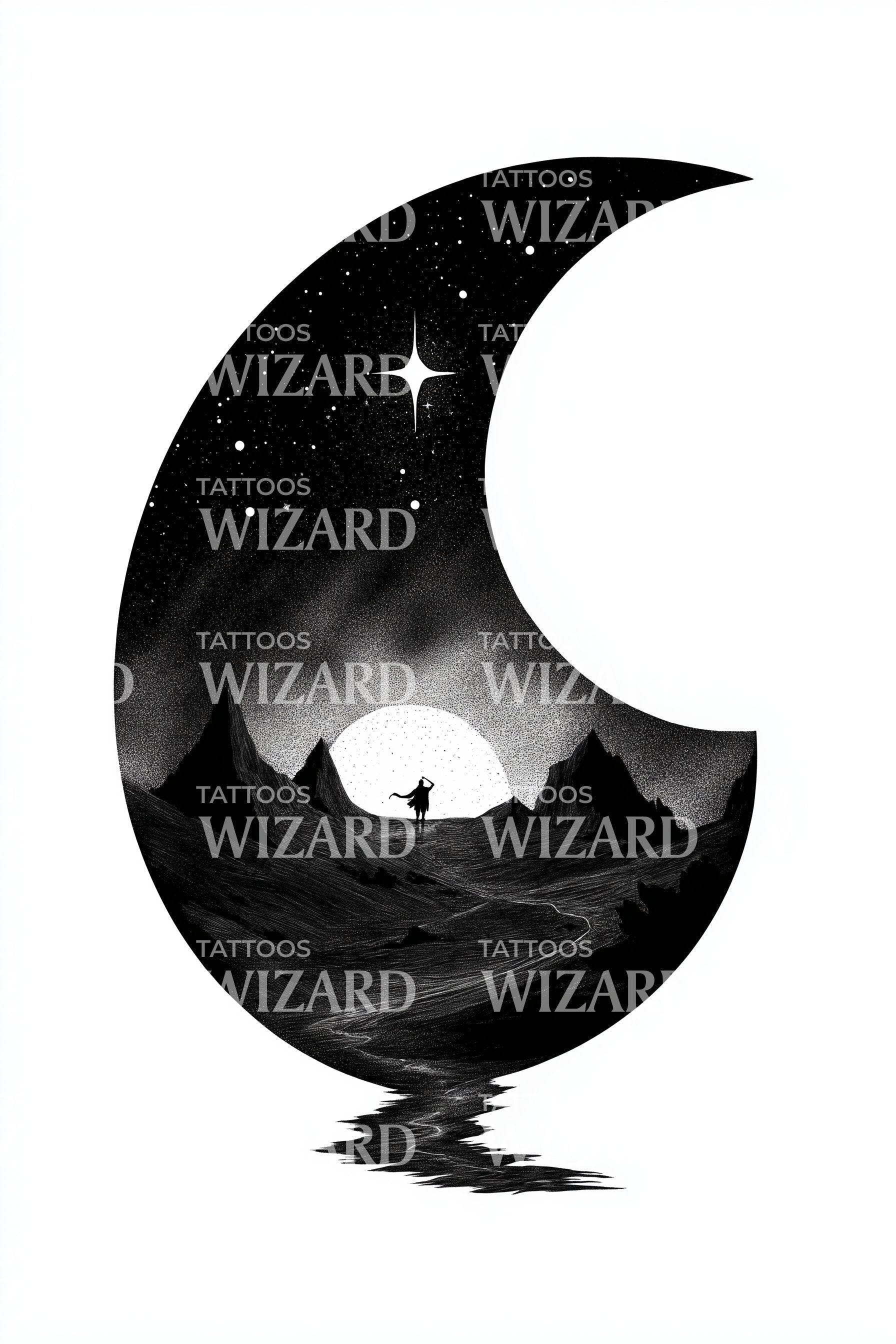 Midnight crescent cradles a starry sky, dot-shaded mountains, and a lone traveler at the horizon, mirrored by a winding reflection. Blackwork textures carve quiet night scenery. Symbolizing guidance, renewal, and brave solitude, the piece invites steady wonder, grounding its wearer in direction, resilience, spacious calm, and inner clarity.