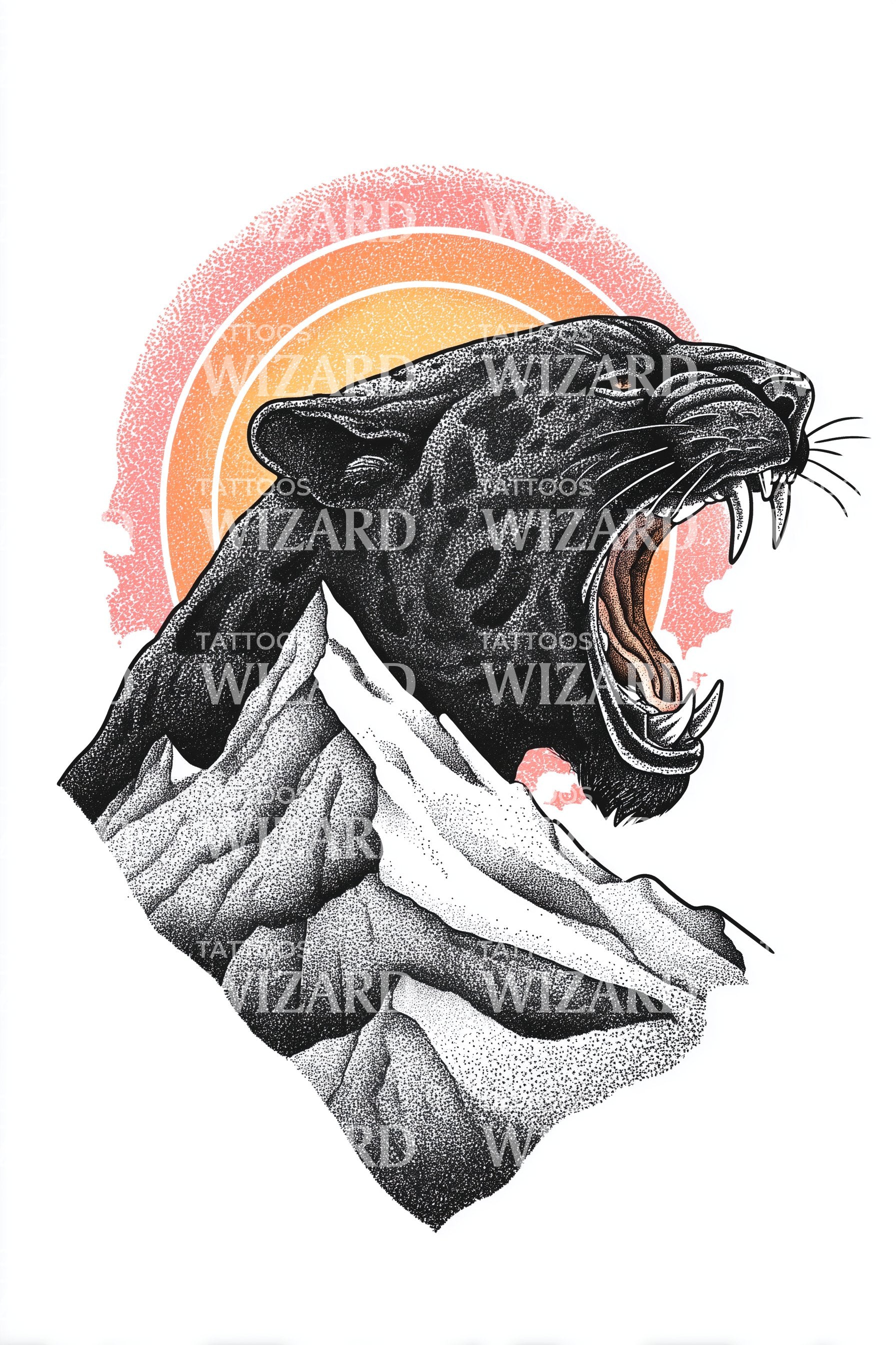 Engedd szabadjára vad oldaladat ezzel a vad párduc tetoválásmintával. Egy elbűvölő naplemente narancssárga árnyalataiban fürdőzve, a félelmetes lény dühösen üvölt. Ez az illusztratív minta a nyers állati erőt ábrázolja, és izgalmas éllel gazdagítja személyes kifejezésedet.