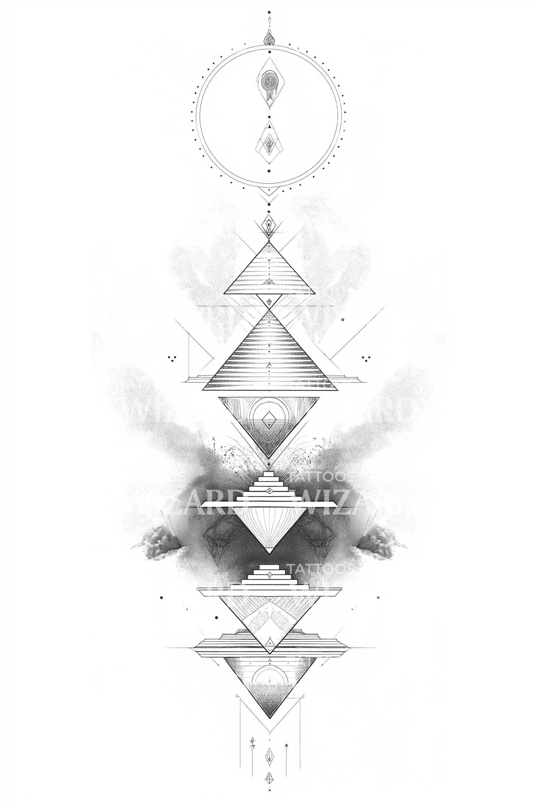 Tekintsd meg ezt a kifinomult triád tetoválásmintát, amely ragyogóan emeli ki a felemelkedést és a piramisokat absztrakt pontmunkával. Kísérletezik a háromszögek harmóniájával—lenyűgöző és bonyolult. Ez a minta a szimmetria és a mélység gyönyörű keveréke, amely lenyűgöző és különleges üzenetet ígér a bőrödön.