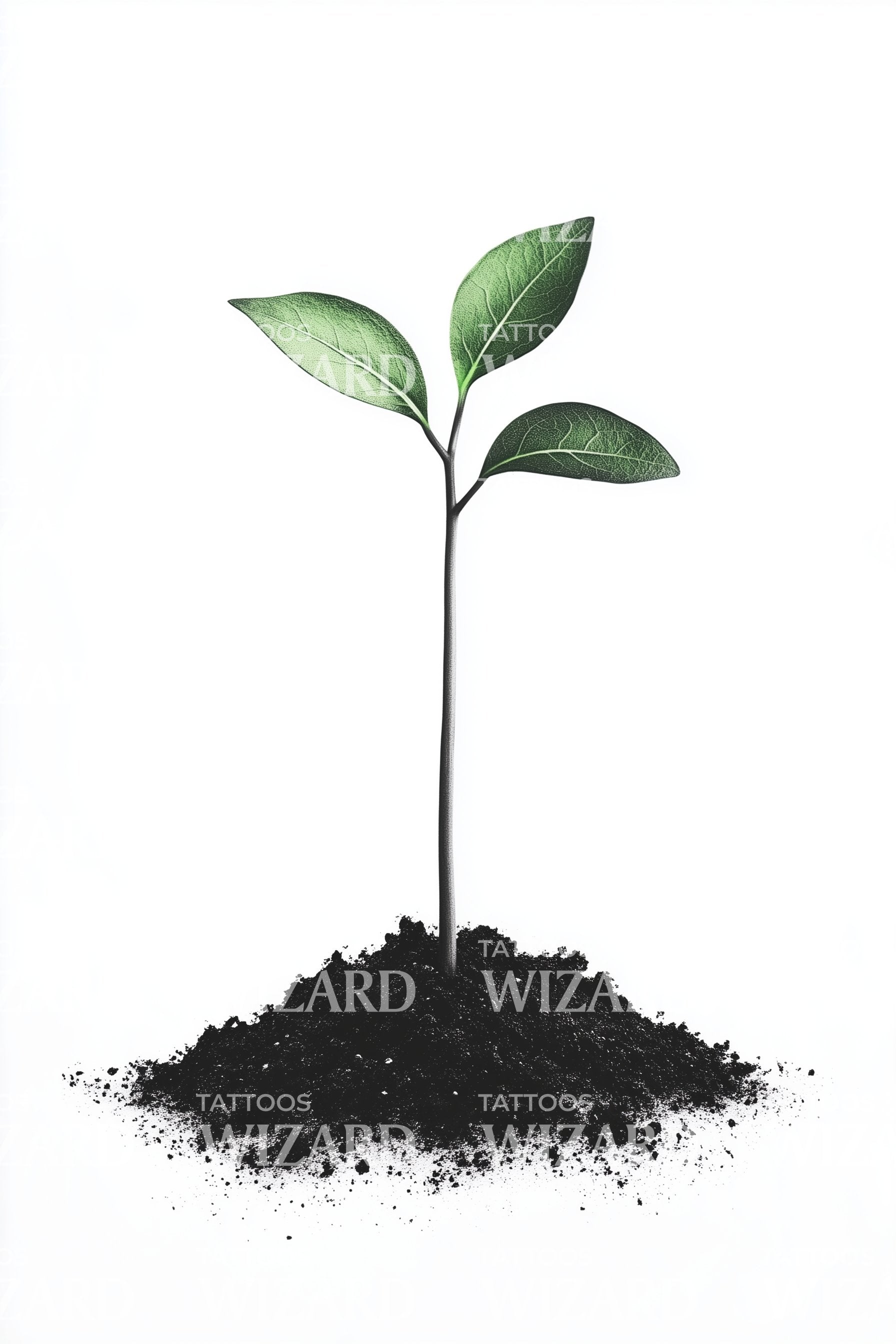 Watercolor seedling rises from an ink-dark crumble of soil, leaves washed in luminous greens and delicate veinwork, suspended in clean white space. Symbol of growth, patience, and quiet resilience, it honors nature’s small victories. Wearing it feels grounding and hopeful, a daily vow to nurture beginnings.
