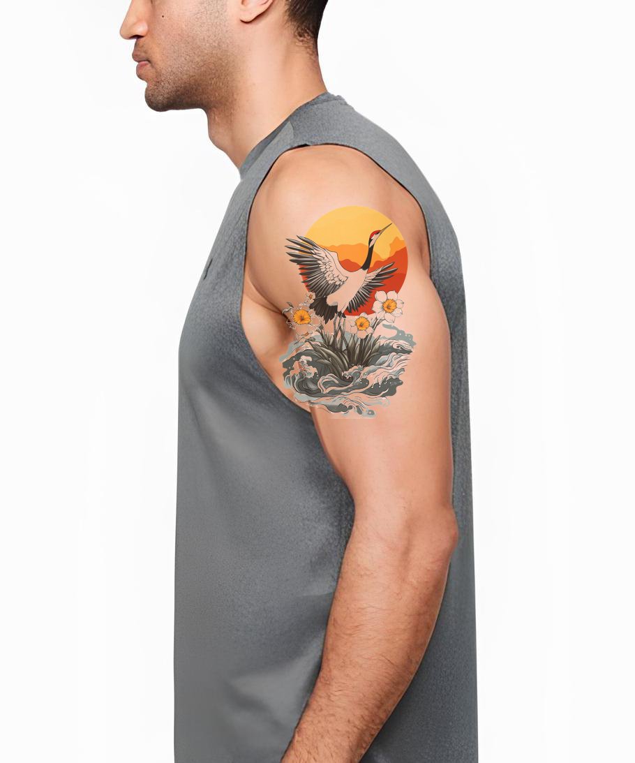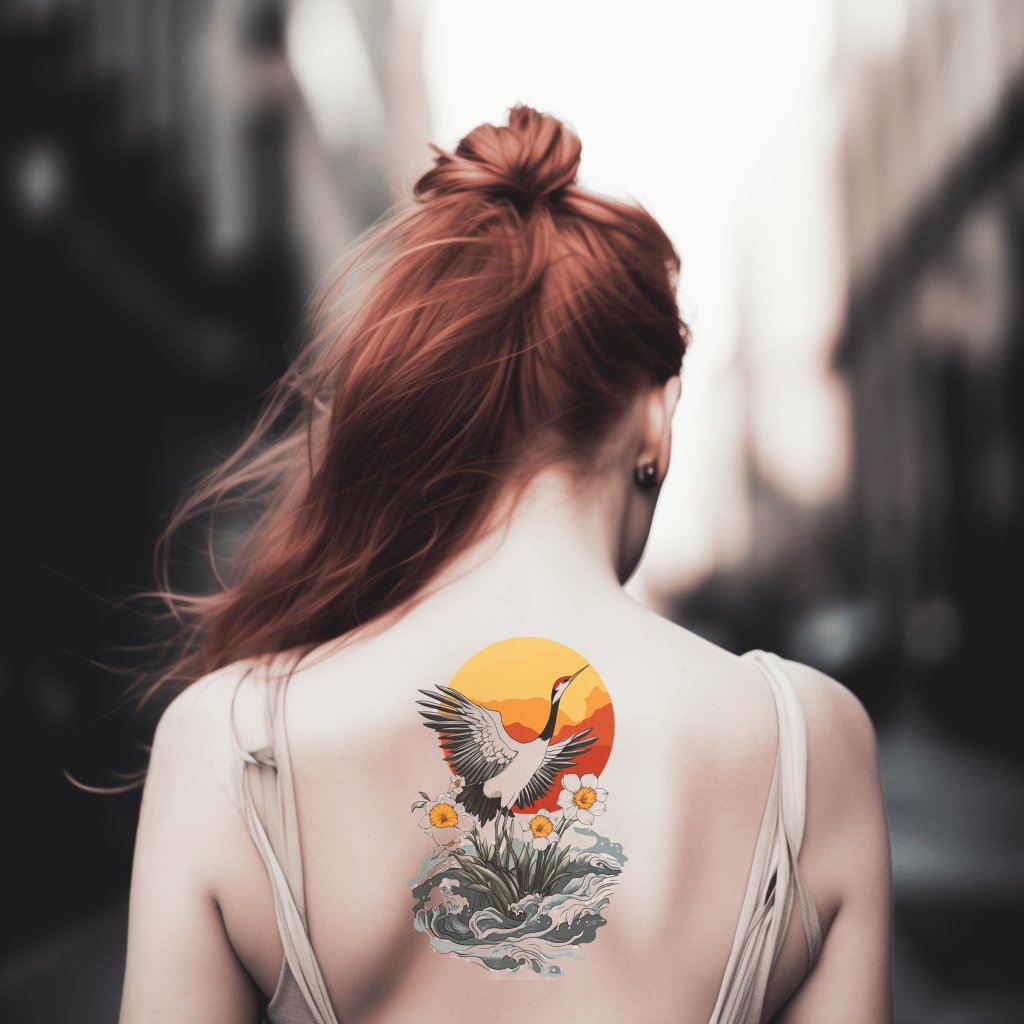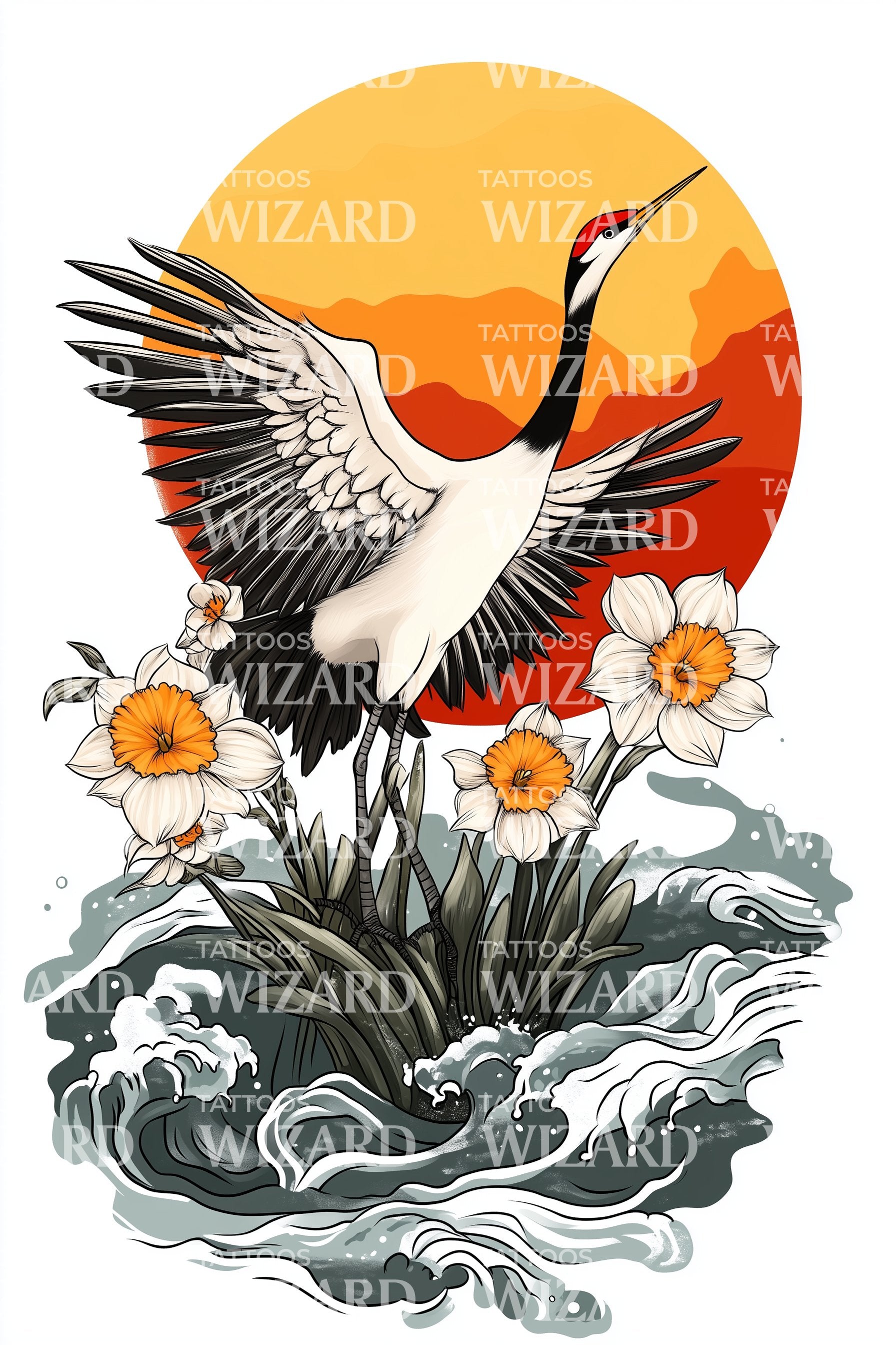 Rasakan keindahan seni Jepang dengan desain tato menakjubkan ini yang menampilkan seekor bangau megah berjemur di bawah sinar matahari yang cerah, dikelilingi oleh ombak yang riang. Menawarkan pesona selama puluhan tahun, desain ini menghubungkan Anda secara mendalam dengan harmoni alam dan ketenangan estetika tradisional Jepang.