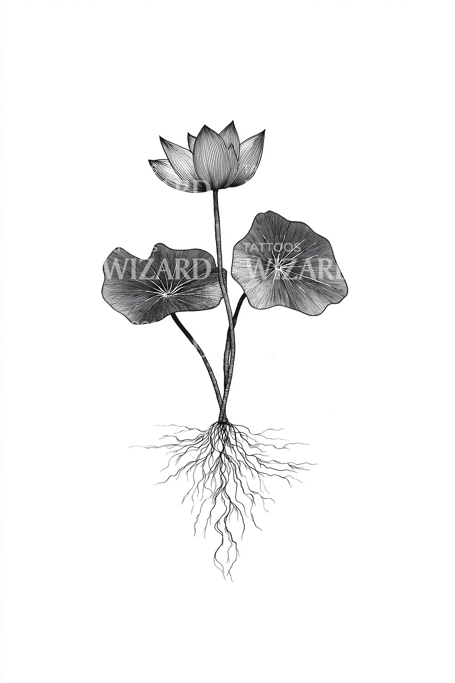 Lotus linework unfurls above two veined leaves, slender stems and airy, threadlike roots rendered in graceful blackwork. A botanical study of awakening, the bloom rises clean from murky depths while roots honor grounding and ancestry. Worn on skin, it breathes calm resilience, spiritual clarity, and connection to nature.