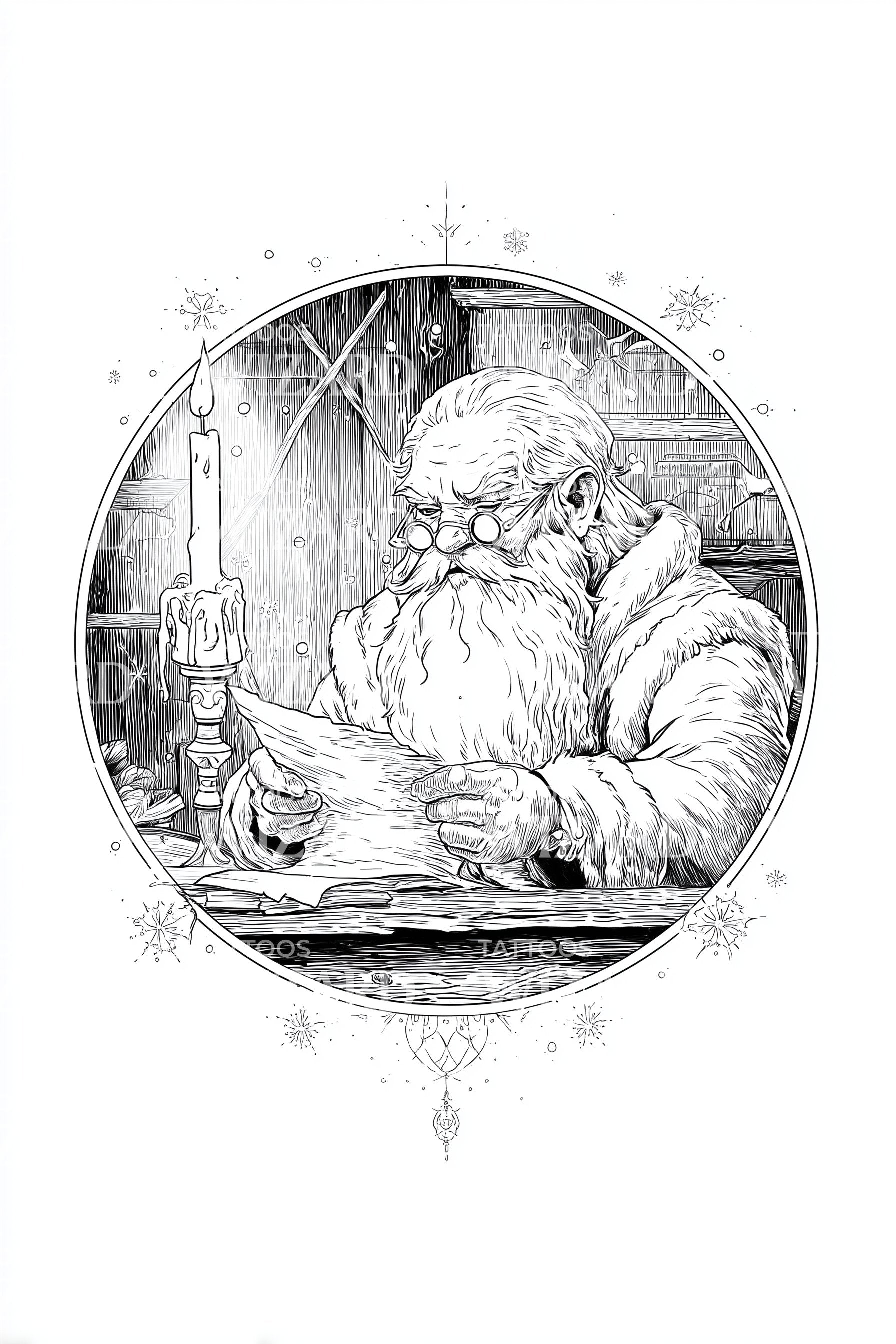 Black&grey realism frames Santa at his desk, candle flickering, snow ticking the window as letters rustle. The scene honors hope written by small hands and the quiet devotion of giving. Worn script symbolizes wishes kept. Wearing it feels hearth-warm, nostalgic, patient, timeless Christmas faith and wonder everlasting inside.