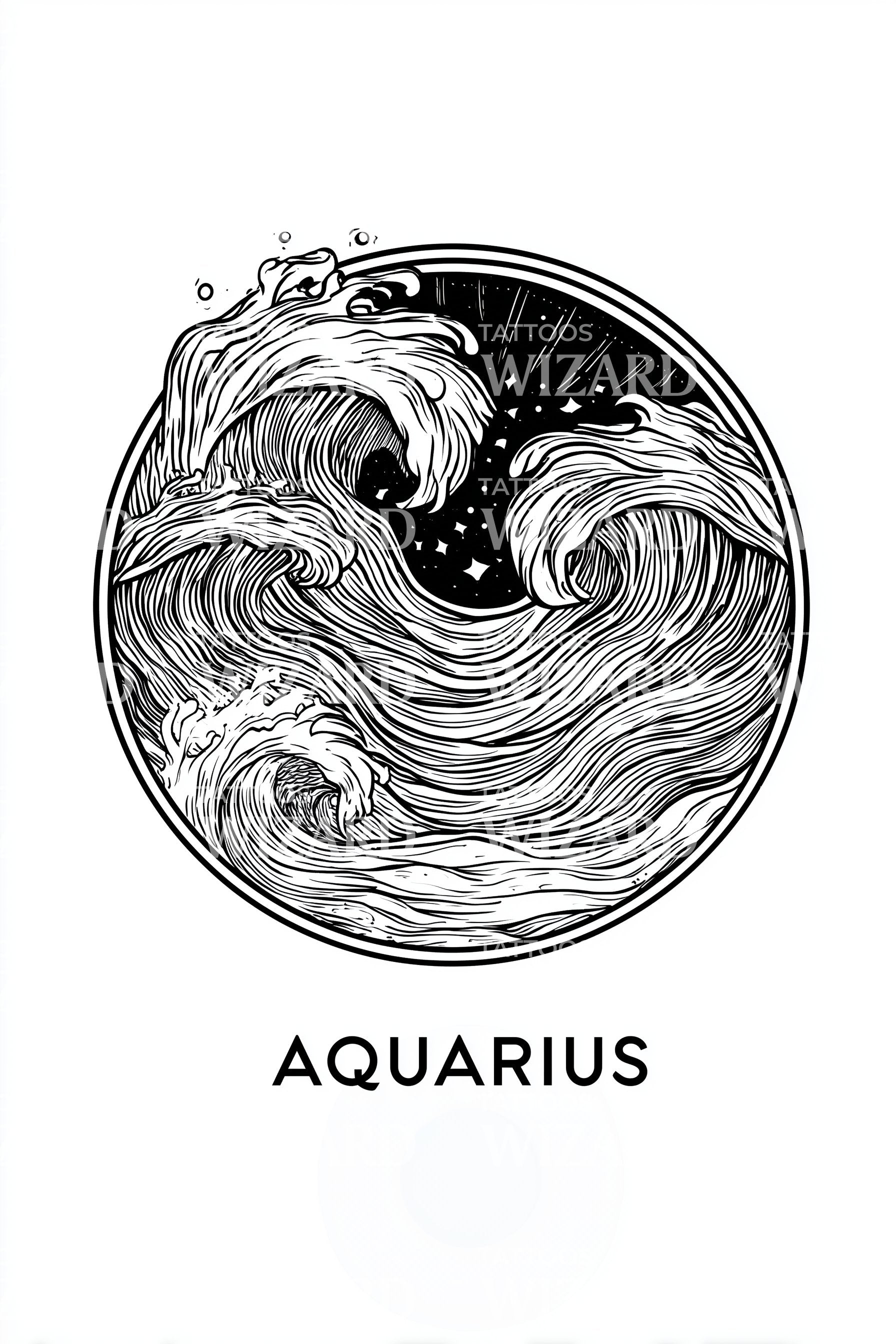 Celestial waves swirl within a circle, etched in meticulous dotwork and fine lines, a spiral tide cresting beneath starry air. Symbolizing Aquarius, it merges water’s intuition with air’s vision, channeling change. Worn on skin, it feels like breathing saltwind clarity, a vow to move, uplift, and awaken.