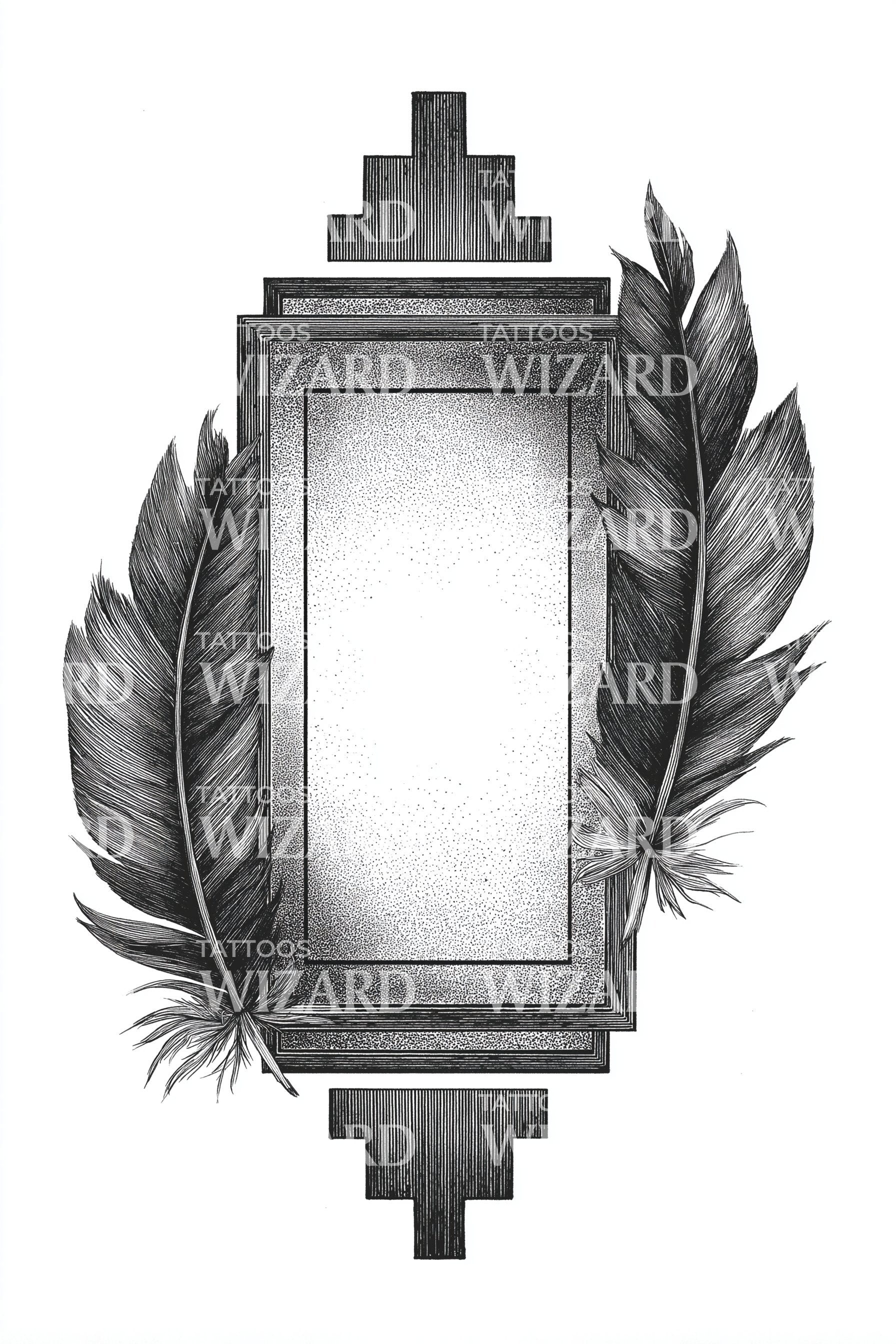 Stepped Aztec geometry forms a sacred frame, shaded with stippled light, embraced by twin detailed feathers. Ornamental lines echo tribal architecture, a portal for stories and intention. Feathers speak of freedom, guidance, and ascent, while the frame grounds purpose. Worn on skin, this design becomes armor and guidance.