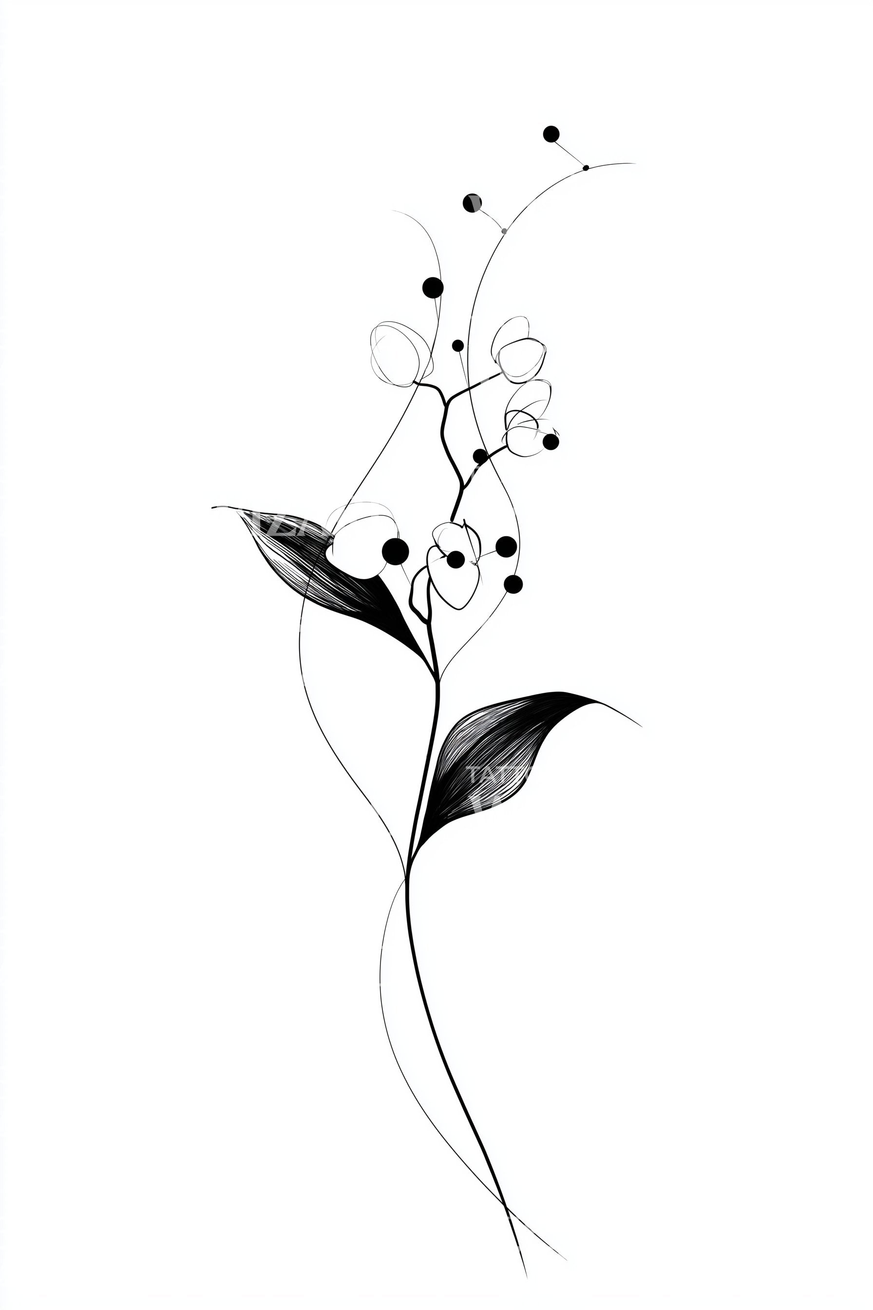 Immergiti nell'eleganza del minimalismo con questo disegno di tatuaggio fineline. Presenta un delicato rametto adornato da piccole bacche, incarnando un'estetica botanica unica. L'elegante semplicità di questo tatuaggio cattura la bellezza della natura nella sua forma sobria, rendendolo una scelta sublime per ogni appassionato di tatuaggi.